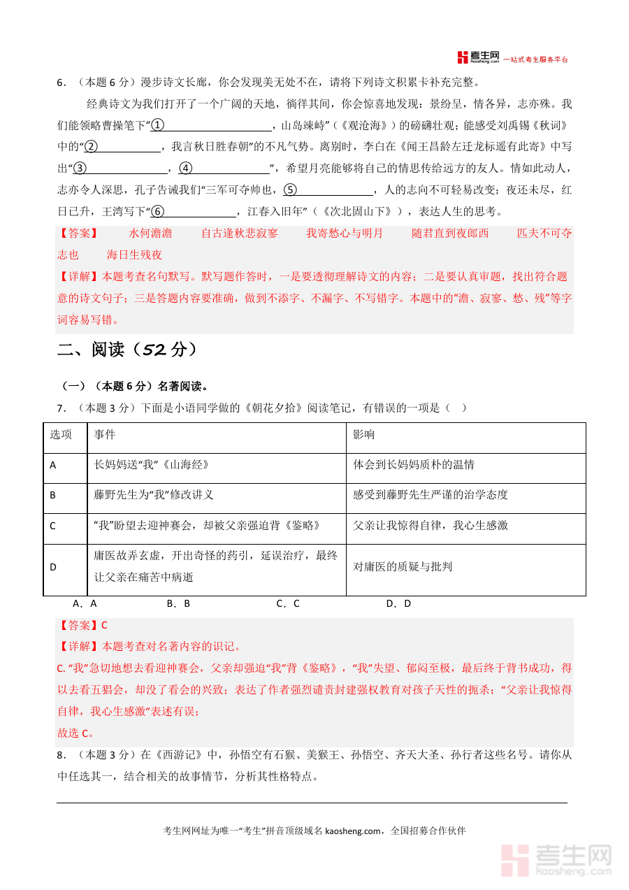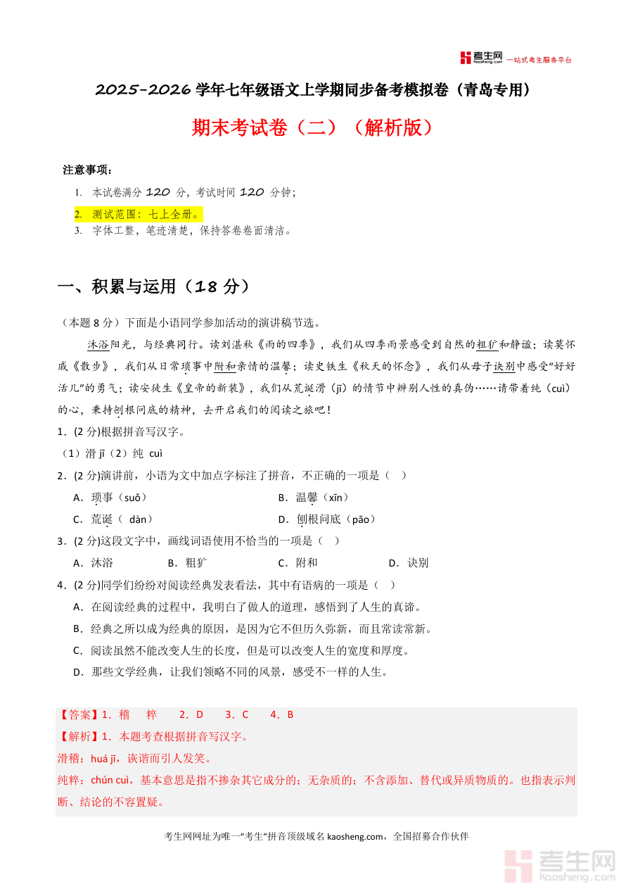 《【青岛专用】期末考试卷(二)-2025-2026学年七年级语文上学期同步备考模拟卷(统编版2024)(解析版).docx》是一份针对青岛地区七年级上学期统编版语文期末备考设计的专业模拟卷解析资料。其核心定位为同步教材考点、贴合本地考情的备考工具,主要内容涵盖积累运用(字音字形、词语运用、病句辨析、古诗文默写等基础题型)及阅读板块(含名著阅读《朝花夕拾》《西游记》分析、诗词对比阅读《天净沙·秋思》与《秋词》解读等进阶题型);特色亮点在于青岛本地化命题适配、统编版教材2024最新要求同步更新及每道题目的详尽解析——从考点定位到解题思路再到易错点提醒,全方位助力学生掌握核心知识,属于高质量备考资料范畴