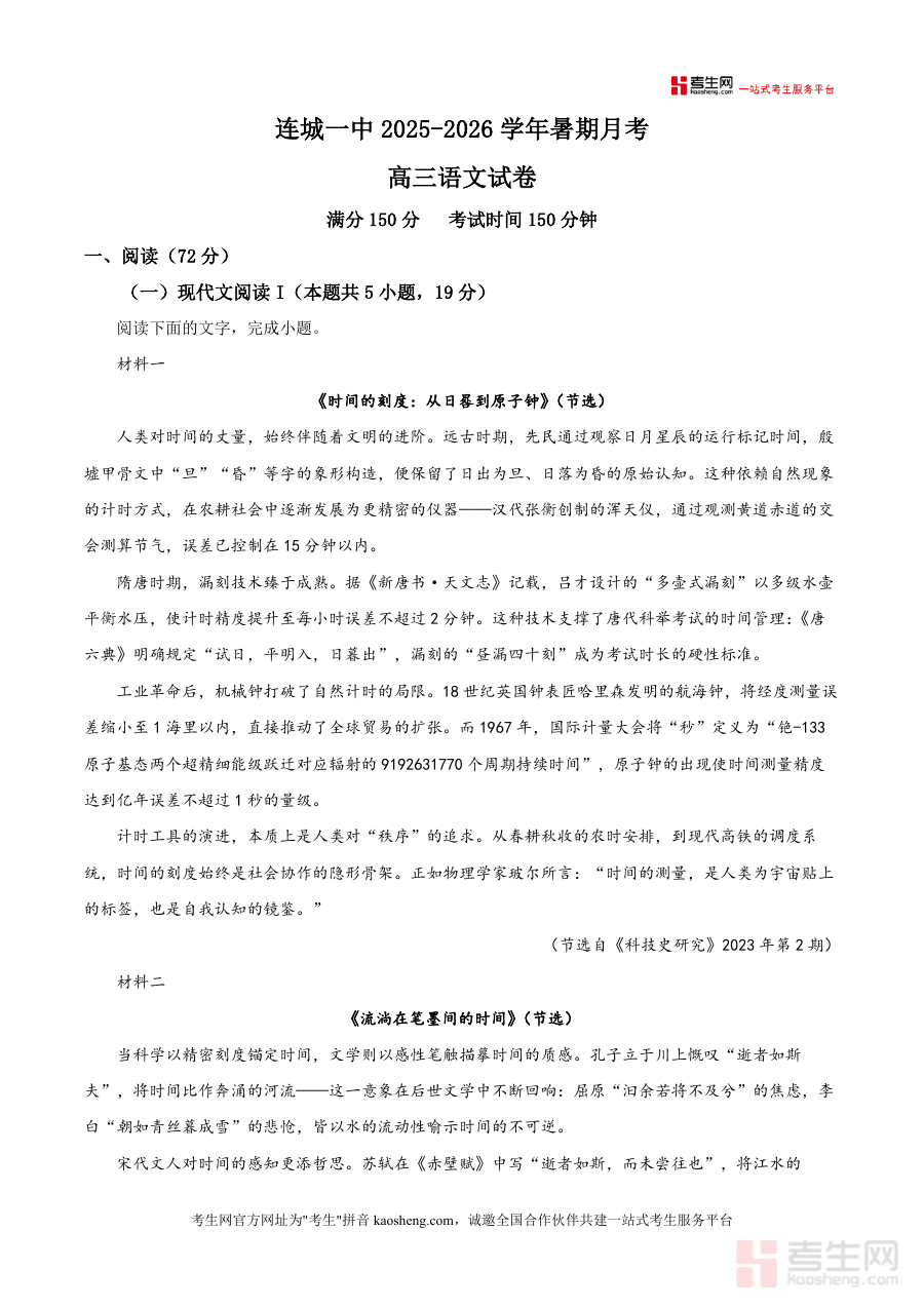 《精品解析:福建省龙岩市连城县第一中学2025-2026学年高三上学期8月月考语文试题(解析版).docx》是一份针对高三起始阶段学情精准设计、贴合福建本地高考命题趋势的专属备考资料。该资料包含完整高三语文月考真题(满分150分,覆盖现代文阅读I/II、古诗文阅读等核心模块)及配套深度解析;真题选取聚焦跨学科主题(如多文本阅读围绕"时间"展开科学史、文学意象、跨学科视野探讨);解析部分不仅提供标准答案,更细化考点拆解(如现代文阅读错误选项的偷换概念、逻辑谬误分析)及学科素养导向的答题思路引导,是兼具实用性与专业性的数据解析范本.