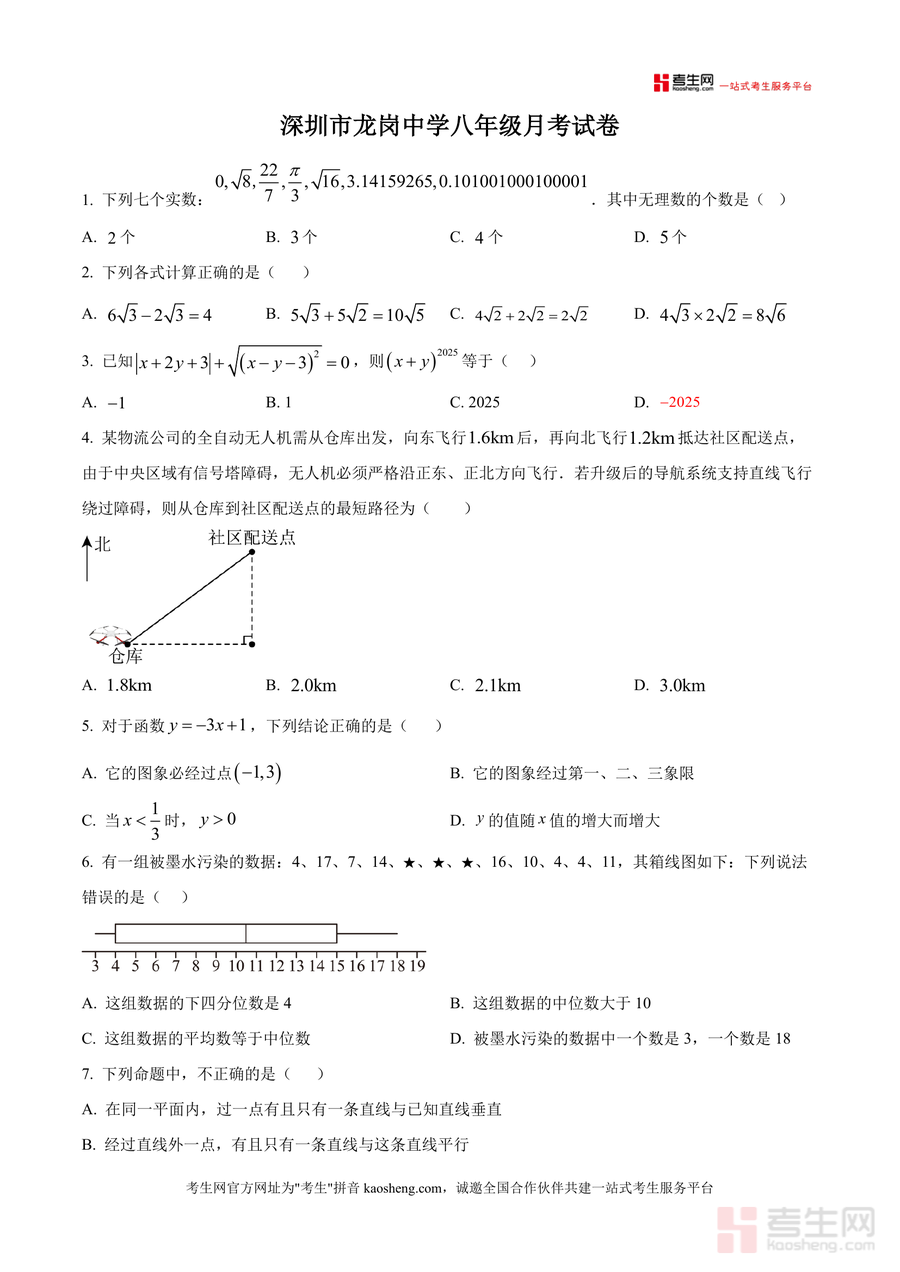 《精品解析:广东省深圳市龙岗中学2025-2026学年上学期八年级月考数学试卷(原卷版)》是一份针对深圳市龙岗中学八年级学生月度学业检测设计的高质量备考资料,涵盖实数分类、根式运算、一次函数性质、几何证明、统计分析等八年级数学核心知识点,试卷结构贴合深圳本地教学进度与考试要求,题型包括选择题、填空题、解答题三大类,全面覆盖月考常考考点与命题方向,能精准反映该校阶段性教学重点与学生需掌握的能力目标。