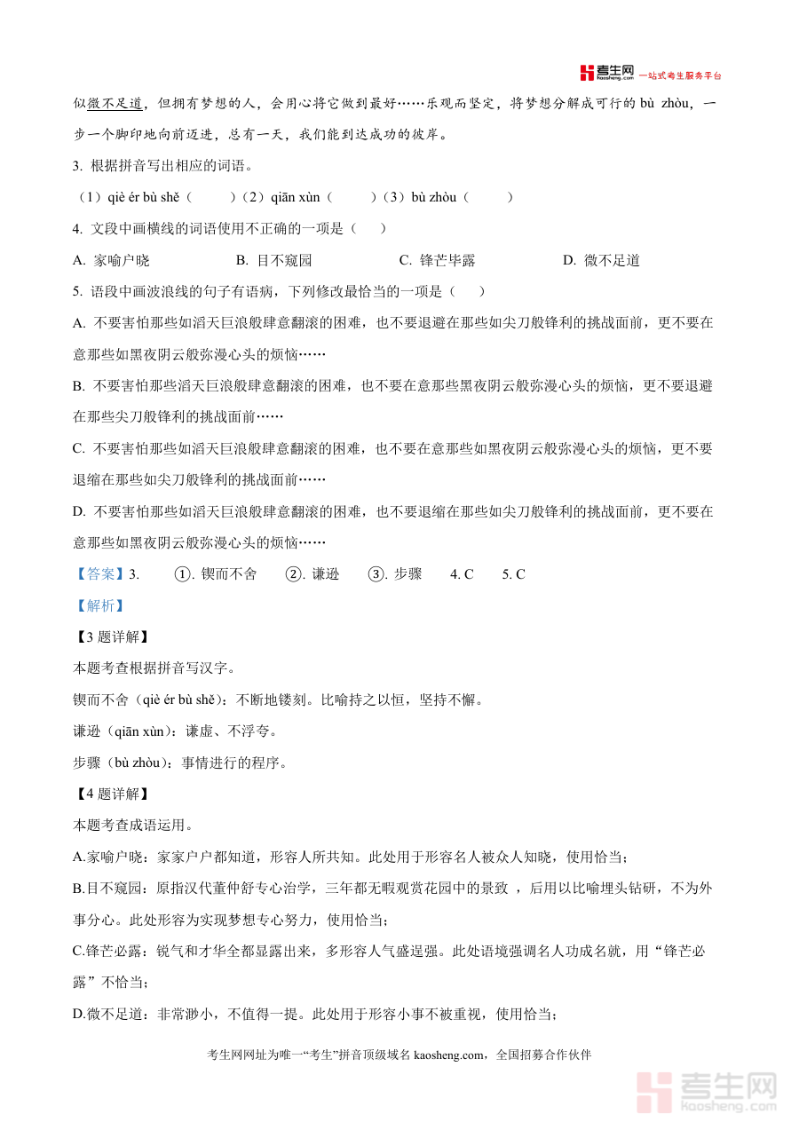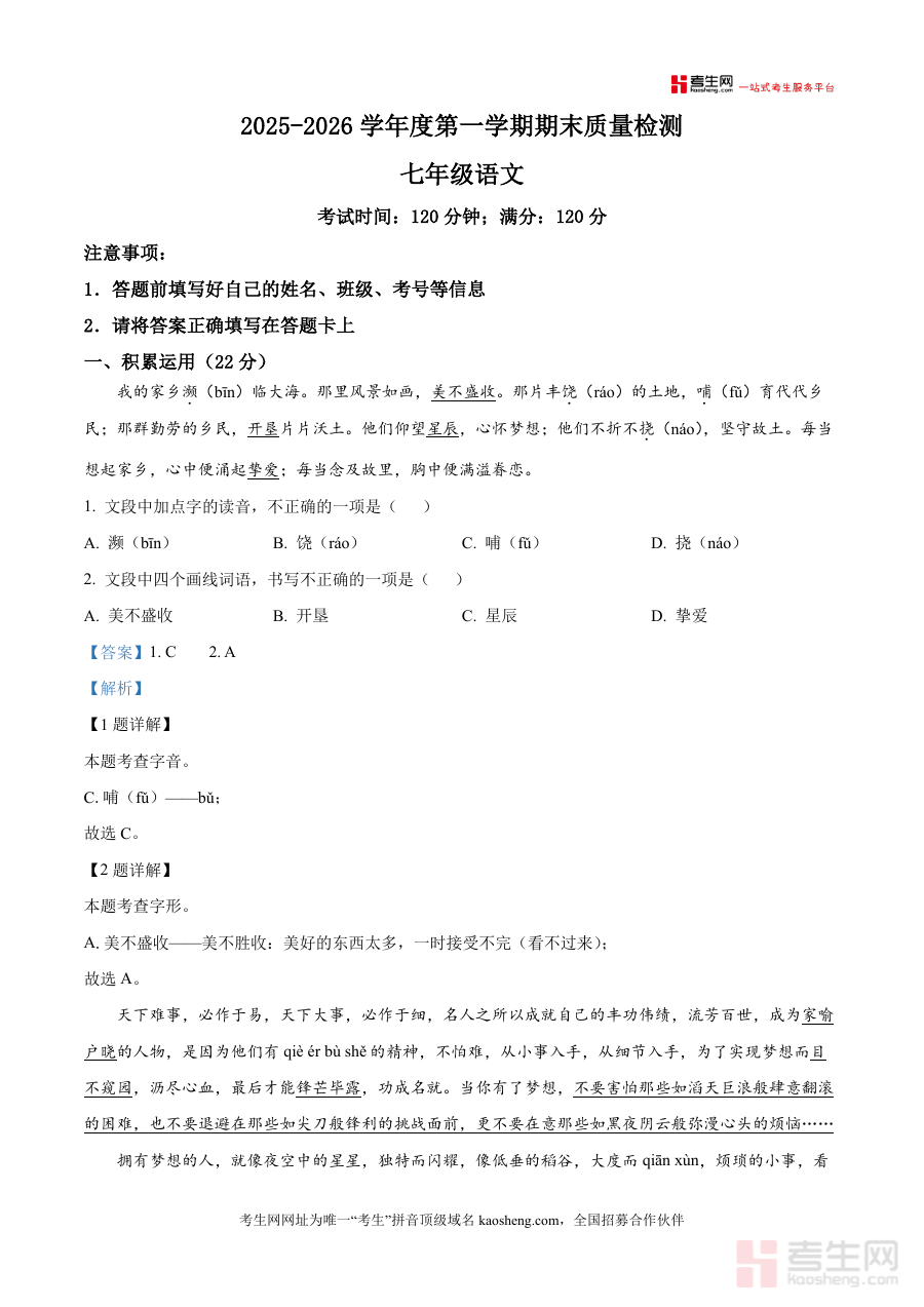 《精品解析:山东省青岛超银中学2025-2026学年七年级上学期期末语文试题(解析版).docx》是一份针对青岛超银中学七年级上册期末语文考试的精准真题解析资料,涵盖积累运用、诗歌阅读、名著阅读等核心题型,原题完整呈现且解析详实深入——不仅对字音字形、成语运用、病句修改等基础考点进行逐题拆解(如加点字读音错误辨析、成语使用不当分析),还针对古诗文赏析、名著情节理解等能力题型提供答题思路与方法指导,特色亮点在于结合本地学情设计解析,融入教材关联知识点,帮助使用者快速把握考试重点,是高质量备考资料的典型代表。