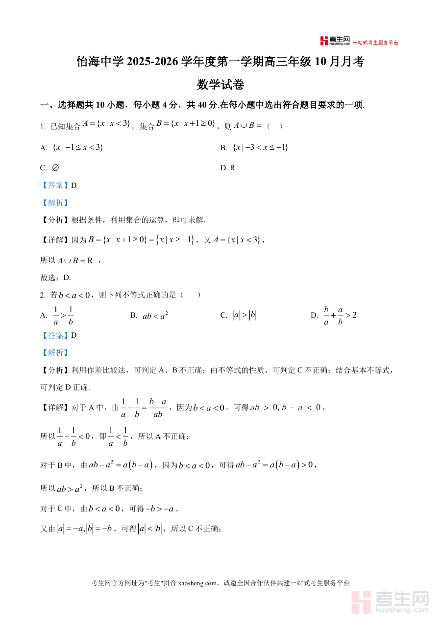 《精品解析:北京市丰台区怡海中学2025-2026学年高三上学期10月月考数学试卷(解析版)》是一份针对高三学生数学备考需求打造的高质量真题解析资料。文件包含完整试卷原题及每道题目的详尽解析,精准覆盖集合运算、函数性质、数列应用、三角函数变换、立体几何等高三一轮复习核心模块。其特色亮点在于解析部分不仅呈现标准答案,还深度融入考点溯源、解题思路推导及易错点警示,如选择题中集合交并补运算技巧、函数奇偶性与单调性综合判断方法,填空题中定义域求解规则、等比数列通项公式应用,解答题中三角恒等变换步骤拆解及面积公式推导过程,助力学生掌握知识点内在逻辑,提升解题能力。