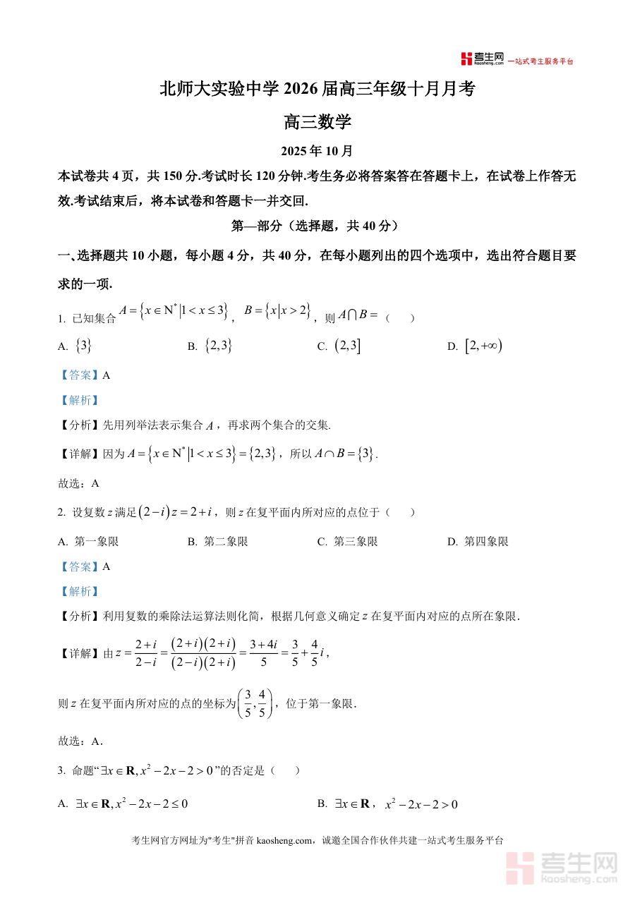 《精品解析:北京市北京北师大实验中学2026届高三上学期10月月考数学试题(解析版)·docx》是一份针对高三学生数学备考的权威真题解析资料,包含北师大实验中学该次月考完整数学试题及逐题详细解析。试题覆盖集合运算、复数几何意义、命题否定、三角函数性质、向量运算、直线与圆位置关系等高中数学核心考点;解析部分通过"分析"拆解解题思路、"详解"展示规范步骤、"名师点睛"总结高频技巧,依托名校资源贴合高考命题趋势,助力学生精准把握考点及题型规律。