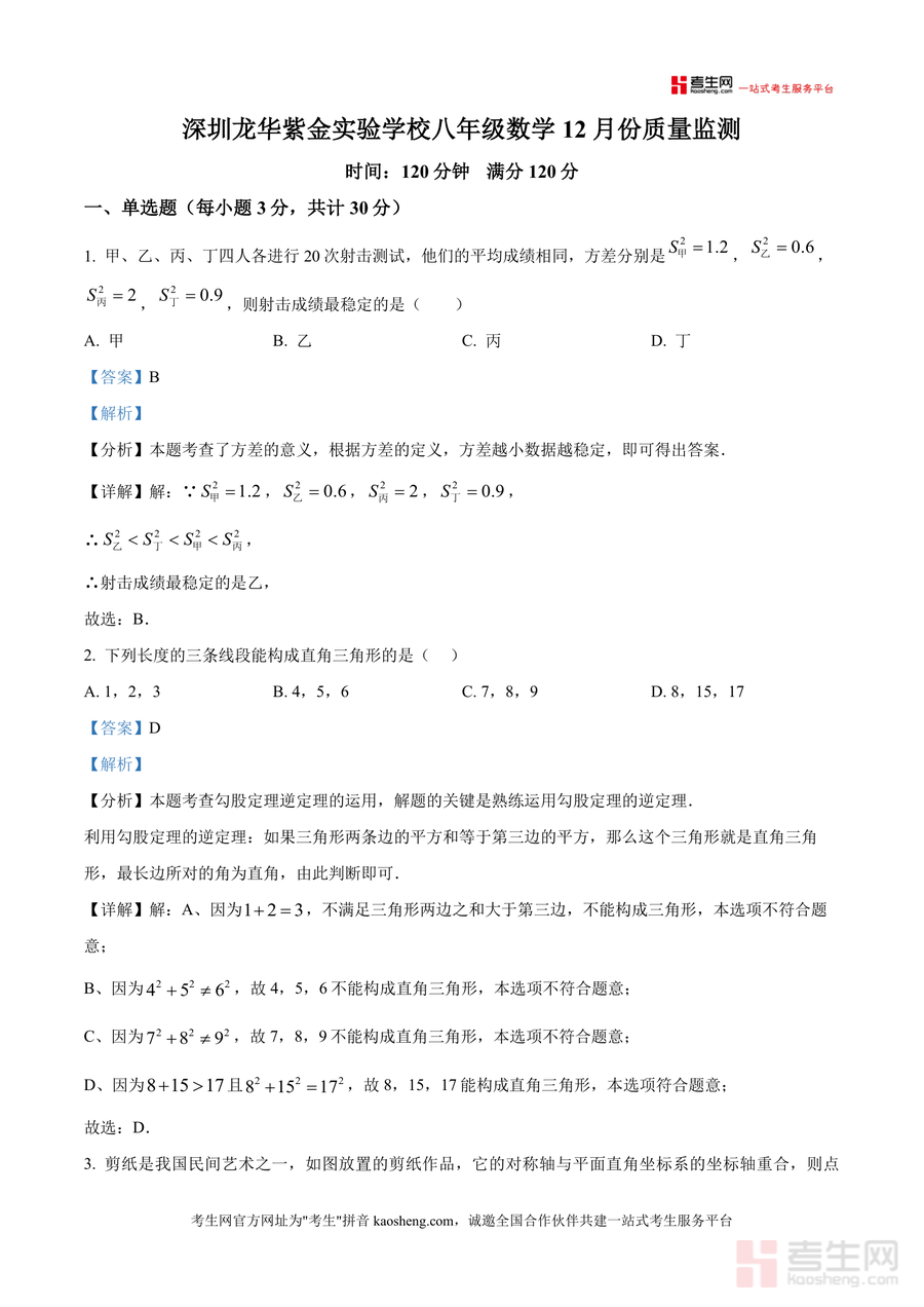 《精品解析:广东省深圳龙华紫金实验学校2025--2026学年上学期八年级数学12月份质量监测试题(解析版)》是一份针对该校八年级数学阶段性评估设计真题解析类备考资料。文件涵盖单选题、填空题、解答题三大题型共20道核心题目及完整详实解析覆盖方差稳定性判断勾股定理实际应用一次函数图像性质二次根式运算等八年级数学核心知识点;解析特色突出学科融合与细节指导如第6题“折竹抵地”问题结合《九章算术》背景解析勾股定理应用场景第16题二次根式运算明确错误步骤及原因提示助力规避误区。