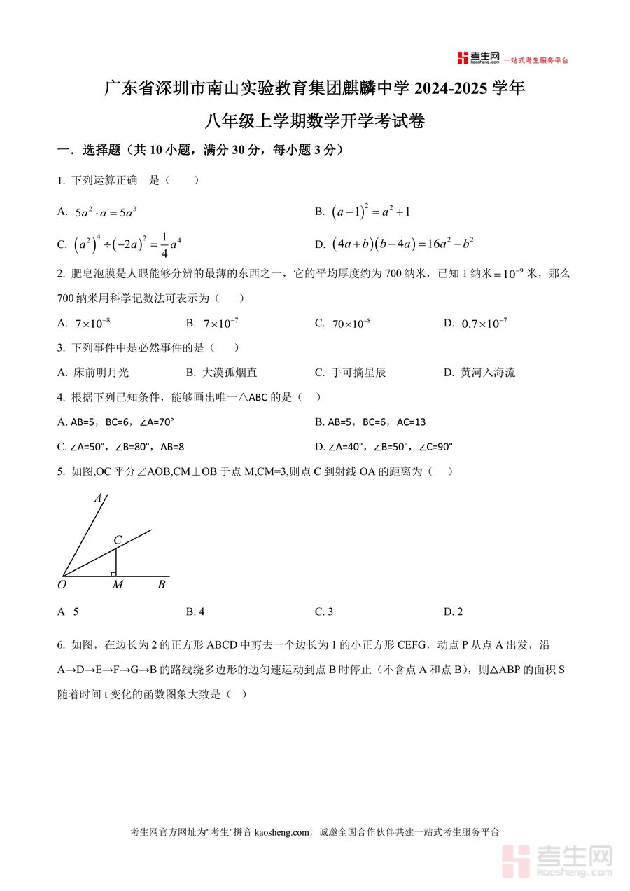 《精品解析:广东省深圳市南山实验教育集团麒麟中学2024-2025学年八年级上学期开学考试数学试题(原卷版)》是一份针对八年级学生开学阶段数学学业水平检测的优质备考资料。试题包含选择题10道、填空题5道、解答题7道三大模块:选择题覆盖代数运算、科学记数法转换、必然事件判定、三角形全等与角平分线性质等基础考点;填空题涉及幂运算规律、概率计算、函数关系式推导及几何边长求解;解答题融合化简求值、几何作图与证明、实际应用问题(如爆破安全距离计算、行程函数图像分析)及拓展探究题(等腰三角形分割、等边三角形旋转综合),全面考查学生的基础知识掌握度与综合应用能力。