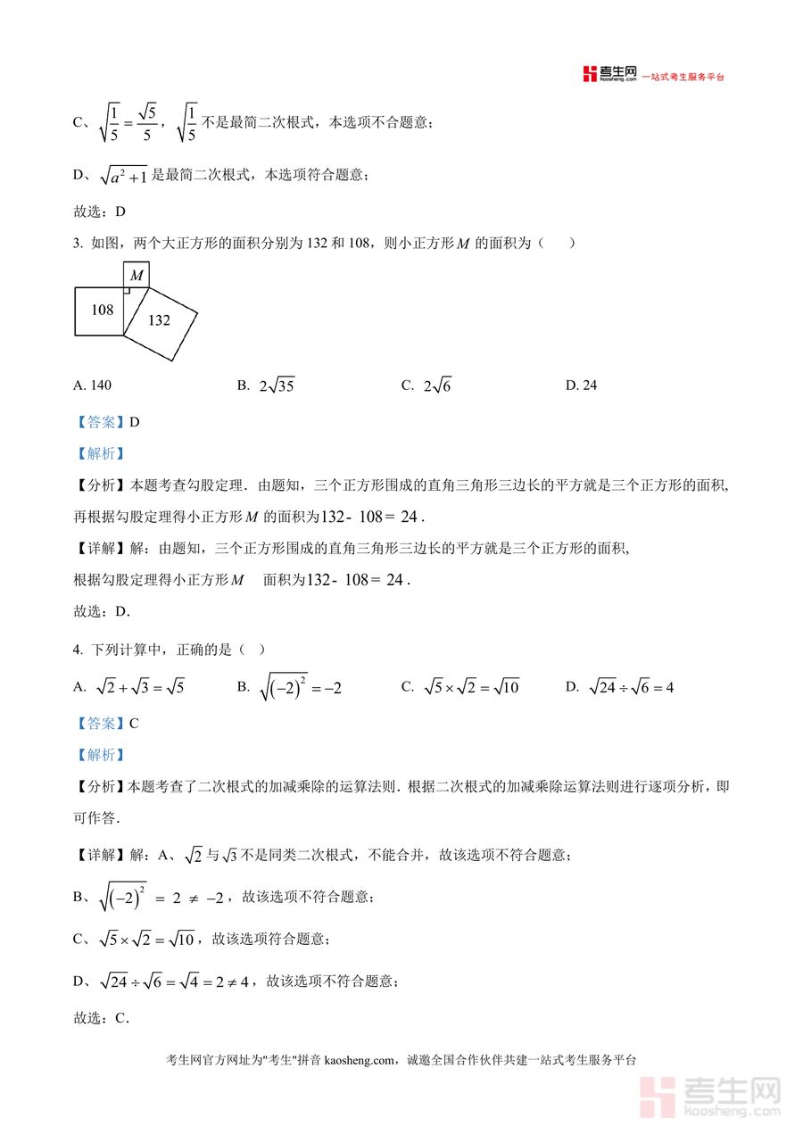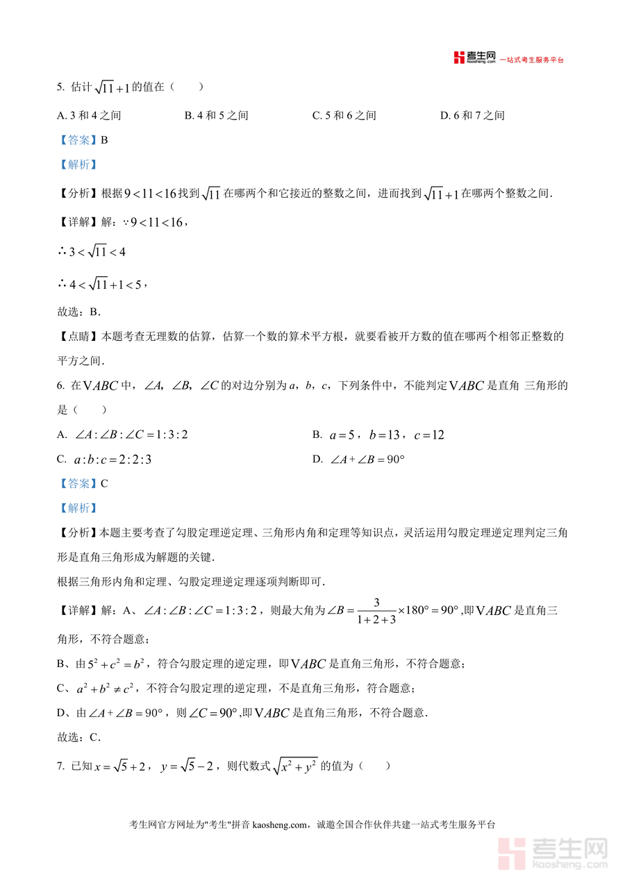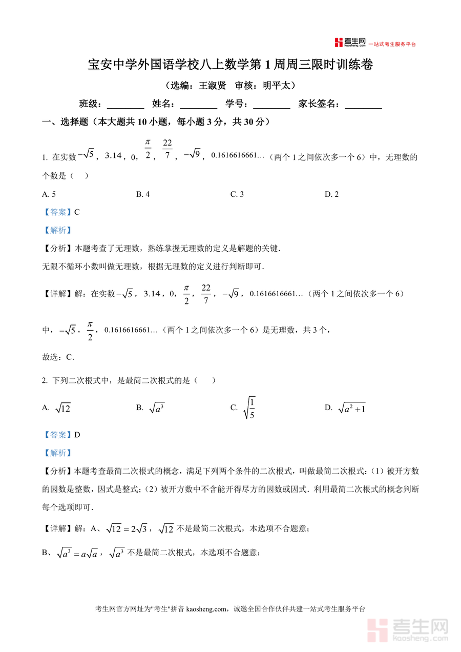 《精品解析:广东省深圳市宝安中学外国语学校2024-2025学年八年级上学期开学考试数学试题(解析版).docx》是一份针对深圳宝中外国语学校八年级学生开学考设计的专业备考资料。该资料包含选择题、填空题、解答题三大题型,覆盖无理数识别、最简二次根式判断、勾股定理应用、二次根式运算等核心知识点,每道题均配备详细解析——不仅有考点分析、步骤拆解还有易错点提示,如选择题中对无理数定义精准解读,解答题里勾股定理在实际场景中的应用推导。作为真题解析类资料,其内容严格贴合该校开学考命题方向,能帮助学生快速把握考点分布。