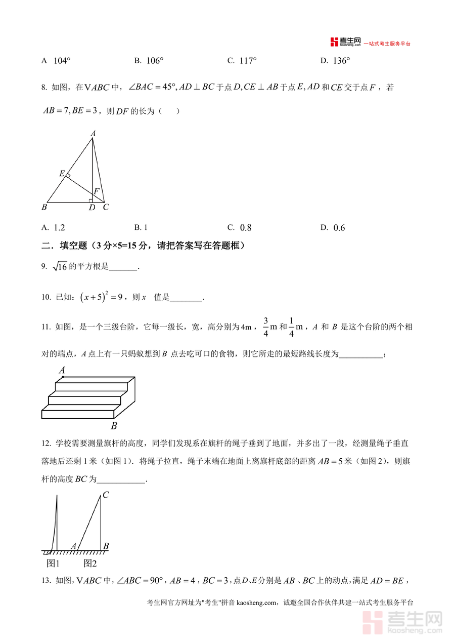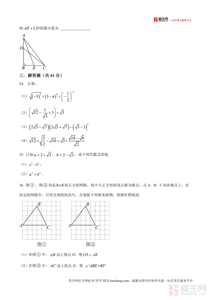 《精品解析:广东省深圳市宝安中学(集团)初中部2025-2026学年上学期八年级开学考数学试卷(原卷版).docx》是一份聚焦八年级开学考的高质量真题备考资料。该资料包含选择题(8道)、填空题(5道)及解答题(7道)三大题型共20道题目,覆盖科学记数法、二次根式运算与合并、勾股定理应用、垂直平分线性质、几何最值求解等八年级数学核心知识点。其特色在于严格还原该校开学考命题风格,保留原题结构与难度梯度,能精准反映考试考查重点与题型分布规律,为学生提供真实的考试场景模拟。
