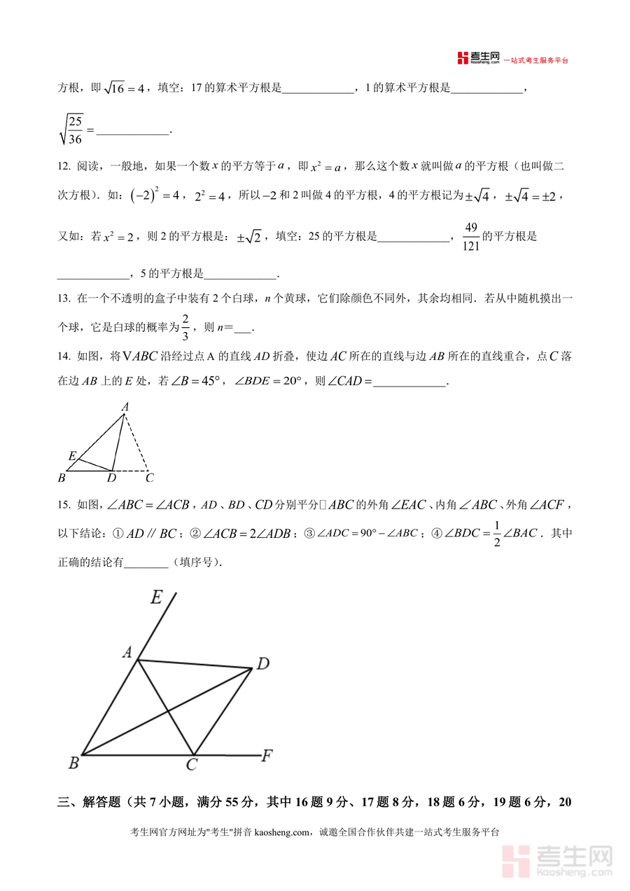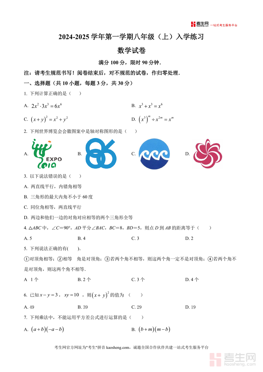《精品解析:广东省深圳市福田区耀华实验学校2024-2025学年八年级上学期开学考数学试题(原卷版)》是一份针对八年级开学阶段数学能力评估的标准化测试资料,主要包含选择题(10小题30分)、填空题(5小题15分)及解答题(7小题55分)三大题型,覆盖代数运算(如幂运算、平方差公式应用)、几何图形(轴对称判定、三角形全等与勾股定理计算)、概率统计(白球概率求解)及综合应用(折叠问题、动点探究等)核心内容。其特色亮点在于贴合深圳福田区耀华实验学校教学进度与命题风格,题型设置兼顾七年级知识巩固与八年级衔接内容考察,题目梯度合理且注重基础能力与综合思维结合,能有效反映学生暑期知识掌握情况。