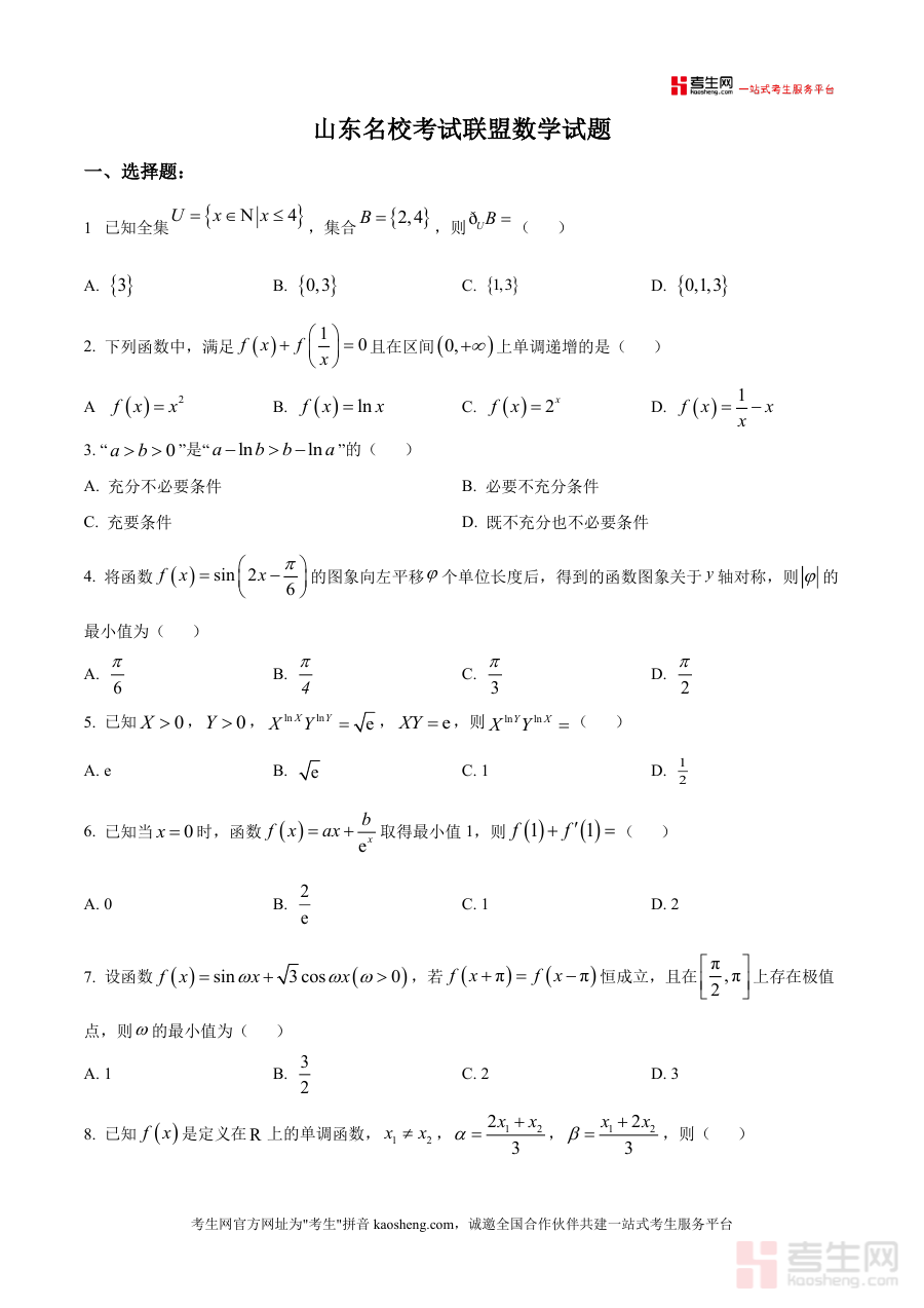《精品解析:山东名校考试联盟2025-2026学年高三上学期10月阶段性检测数学试题(原卷版).docx》是一份面向高三学生阶段性备考的高质量数学检测资料。其内容涵盖选择题(含单选与多选)、填空题及解答题三大题型模块,涉及集合运算、函数性质、三角函数图像变换、导数应用、不等式证明等高中数学核心知识点与能力考点。该试题由山东多所知名高中联合命题,严格遵循高考考纲要求,题型设置贴合高考命题趋势,能全面反映高三上学期初期学生的知识掌握程度与解题能力水平,具备较强的针对性与权威性。