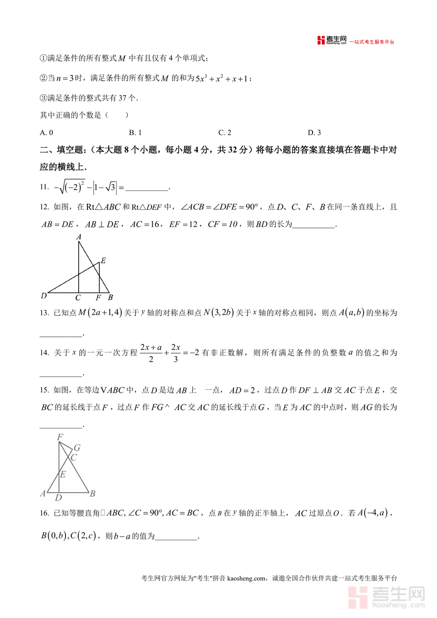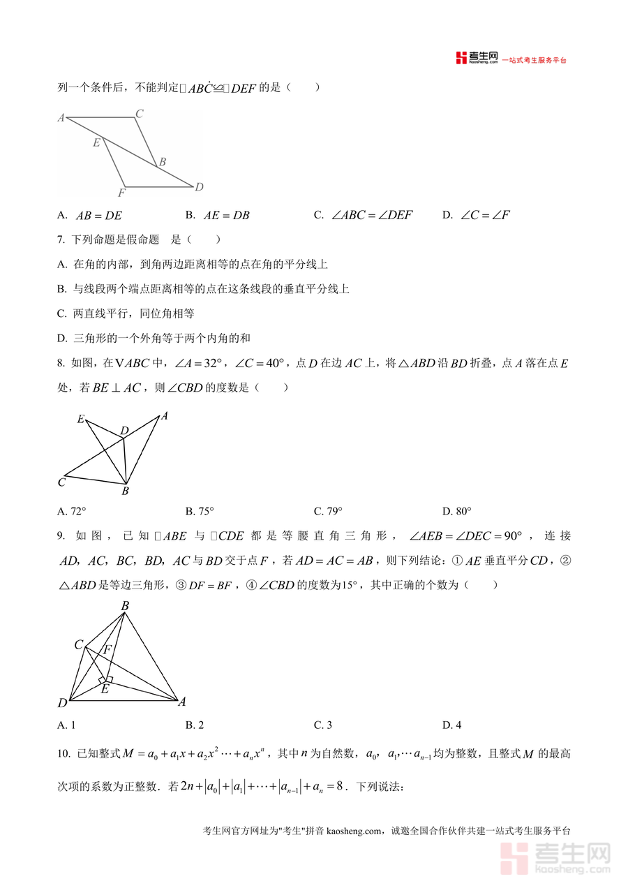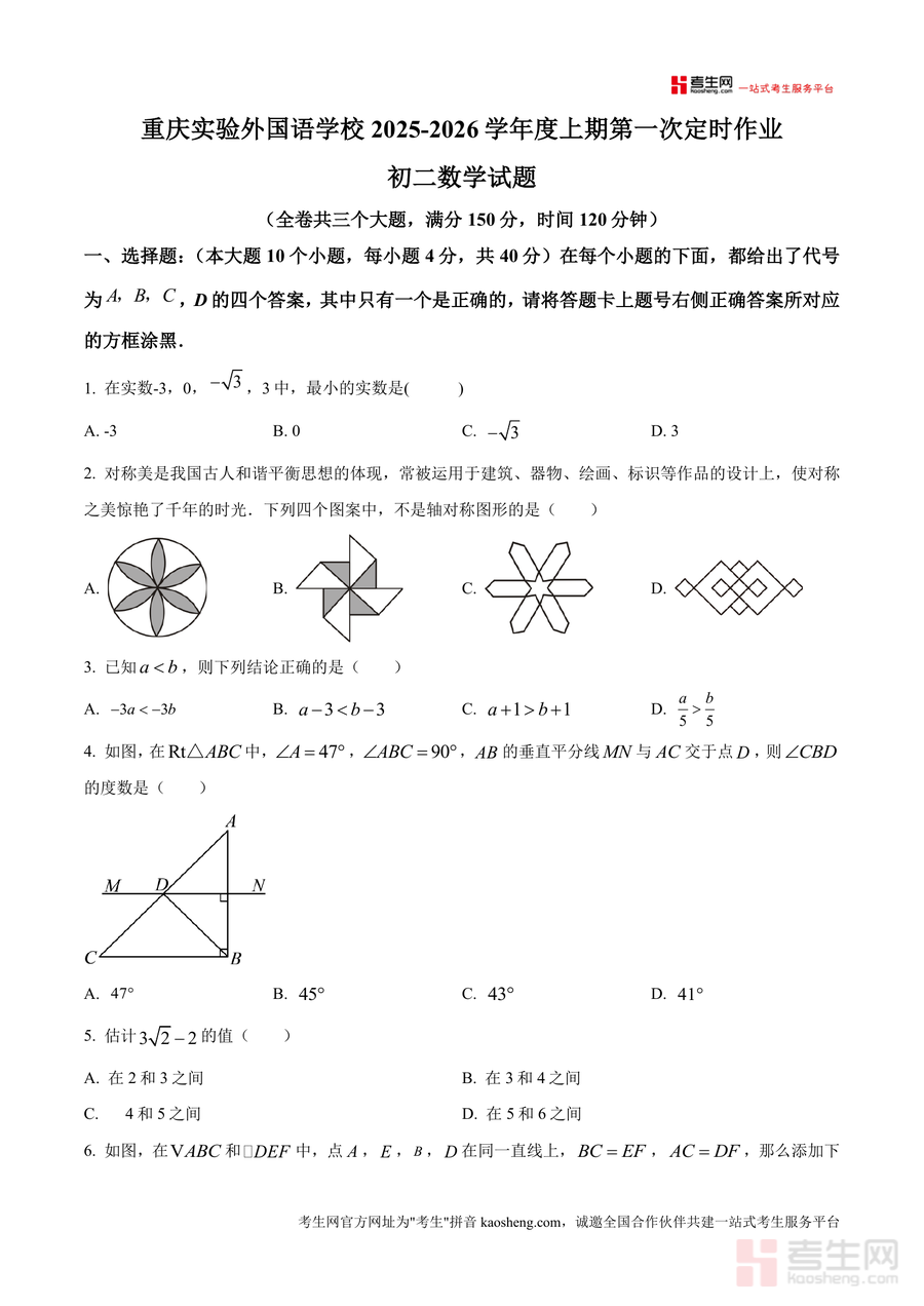 《精品解析:四川外国语大学附属外国语学校2025-2026学年八年级上学期10月月考数学试题(原卷版).docx》是一份针对川外附中八年级数学阶段性检测的权威原卷资料,严格遵循校考命题规范与教学进度。资料包含选择题(10小题,40分)、填空题(8小题,32分)、解答题(8小题,78分)三大题型,全面覆盖实数大小比较、轴对称图形判定、三角形全等证明、垂直平分线性质、不等式组求解等核心知识点。其特色在于完全还原校考原题结构与分值设置,融入重庆实验外国语学校教学特色题型如几何图形折叠问题、等腰直角三角形综合应用等,为学生提供真实校考场景体验。