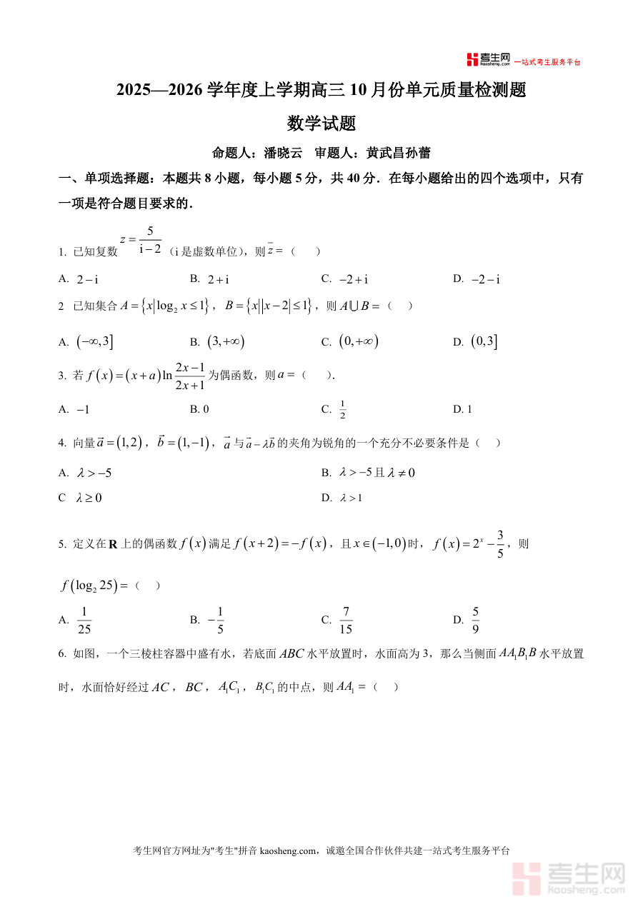 《精品解析:山东省日照市第一中学(海曲校区)2025-2026学年高三上学期第一次阶段性考试数学试题(原卷版).docx》是一份聚焦高三数学阶段性复习需求的专业备考资料。该试题由该校资深教师潘晓云命题、黄武昌与孙蕾审题,内容包含单项选择题(8题)、多项选择题(3题)、填空题(3题)及解答题(5题)四大模块共19道题目,覆盖复数运算、集合交并补关系、函数奇偶性与零点分析、向量夹角判定、等差数列性质、立体几何空间关系、三角函数图像与性质等高三上学期核心知识点。其命题严格遵循该校教学进度与高考考纲要求,题目梯度合理且贴近学生学习实际,能精准反映学生阶段性知识掌握程度与能力水平。