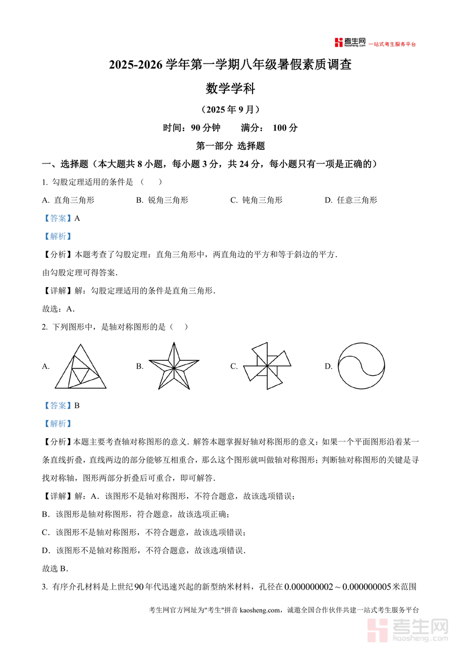 《精品解析:广东省深圳市部分学校2025-2026学年八年级上学期开学考试数学试卷(解析版).docx》是一份针对深圳地区八年级学生开学适应性评估设计的专业备考资料,包含完整试卷原题及逐题深度解析。内容覆盖勾股定理应用、轴对称图形判断、科学记数法、整式运算等核心知识点,并融入区域特色题型如几何图形分割、函数关系式构建等。其特色亮点在于解析部分不仅提供标准答案,还详细拆解考点定位、解题思路及易错点提醒,例如选择题中对勾股定理适用条件进行定理溯源,填空题里结合概率公式推导过程,解答题则展示多种解题方法对比,助力学生精准掌握知识要点。