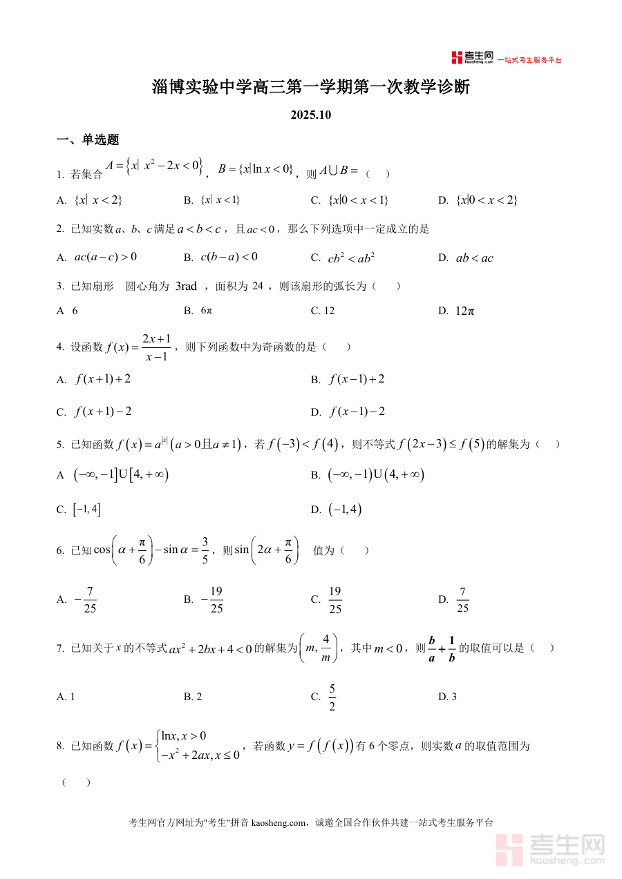 该资料适用于山东省淄博实验中学及周边地区高三学生、高中数学教师及备考指导者。作为高三上学期首次教学诊断的权威原卷资料,其不可替代性在于还原真实考试场景与难度水平,帮助学生建立正确备考认知;长期价值体现在通过分析试卷完成情况,学生可构建个性化知识体系框架,为一轮复习夯实基础,为二轮专题突破提供方向,助力最终高考成绩提升。