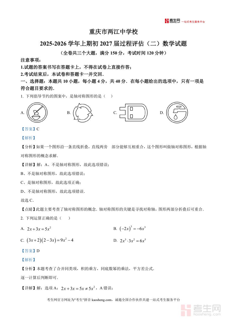 适用人群主要为重庆市两江中学校初二年级学生,也可供同阶段其他学校八年级学生作为数学备考参考。该解析版文件通过系统梳理试题考点与解法,不仅能有效诊断学生阶段性学习情况,还能培养其数学思维与应试能力,具有不可替代的数据参考价值与长期学习指导意义,是八年级数学学习与备考过程中的重要辅助资料。