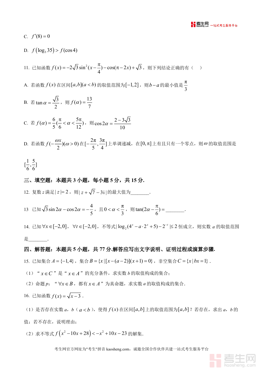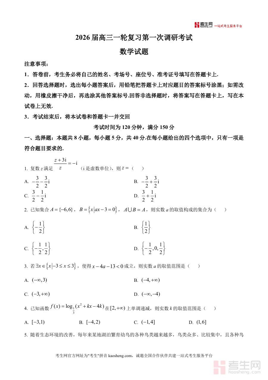 《精品解析:山东省聊城市百师联盟2025-2026学年高三上学期第一次调研考试数学试题(原卷版)》是一份面向高三一轮复习阶段的高质量真题备考资料,聚焦山东新高考数学命题方向,涵盖完整试卷结构与高考高频考点。资料包含8道单选题、3道多选题、3道填空题及5道解答题,题目涉及复数运算、集合关系、函数单调性与极值、三角函数性质、不等式恒成立等核心模块,题型设置贴合最新考试大纲要求。其特色在于题目梯度清晰合理,既有基础巩固型试题也有能力提升型难题,能全面反映学生一轮复习初期的知识掌握情况。