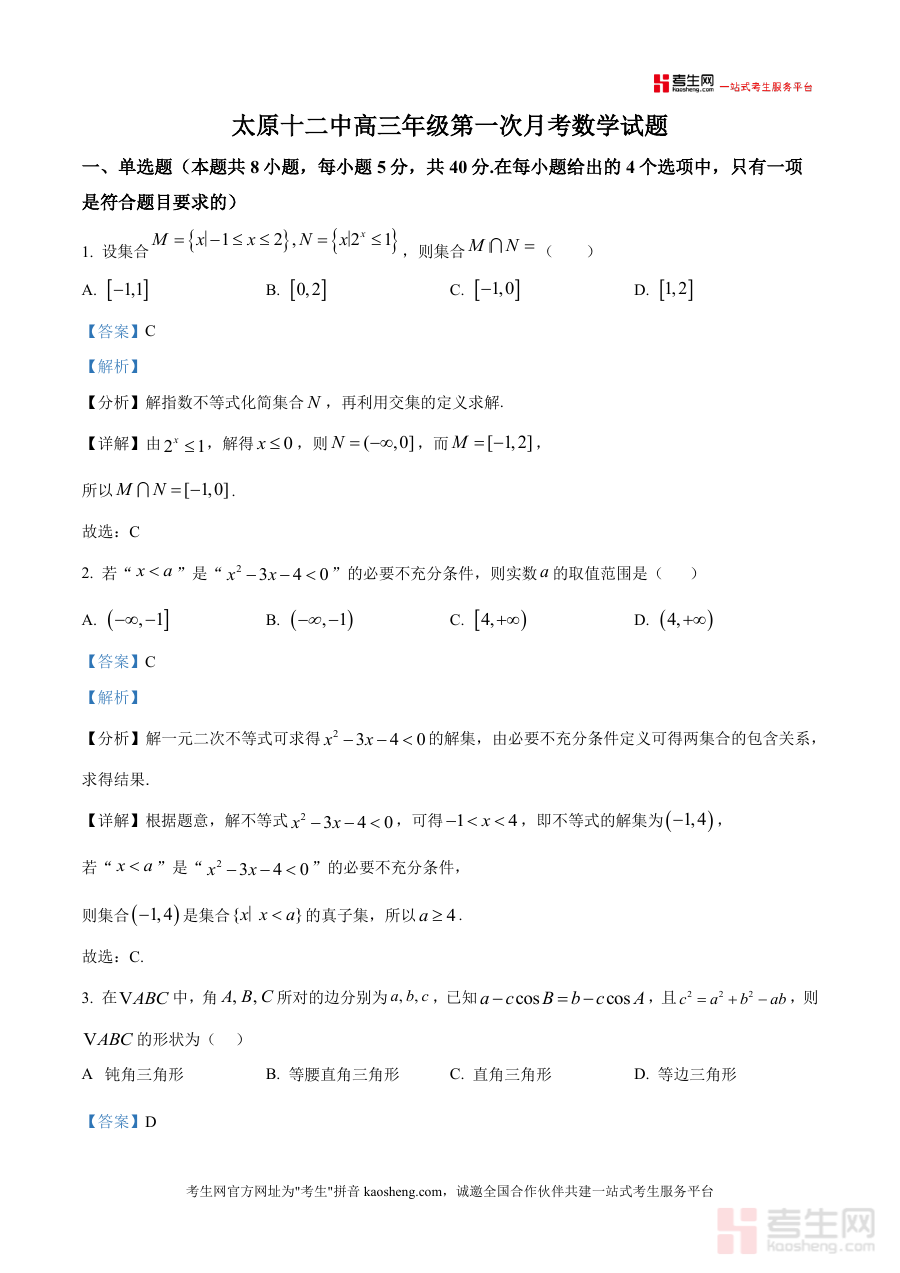 本资料适用于太原十二中及周边同类学校的高三学生、数学教师及高考备考辅导人员。其必要性体现在真题资源稀缺性与针对性,不可替代性在于结合该校月考命题特点进行深度解析,而非泛泛通用资料;长期价值在于帮助使用者构建系统数学知识体系,培养科学解题思维,为后续高考复习奠定坚实基础,是高三阶段提升数学成绩不可或缺的优质备考资料。