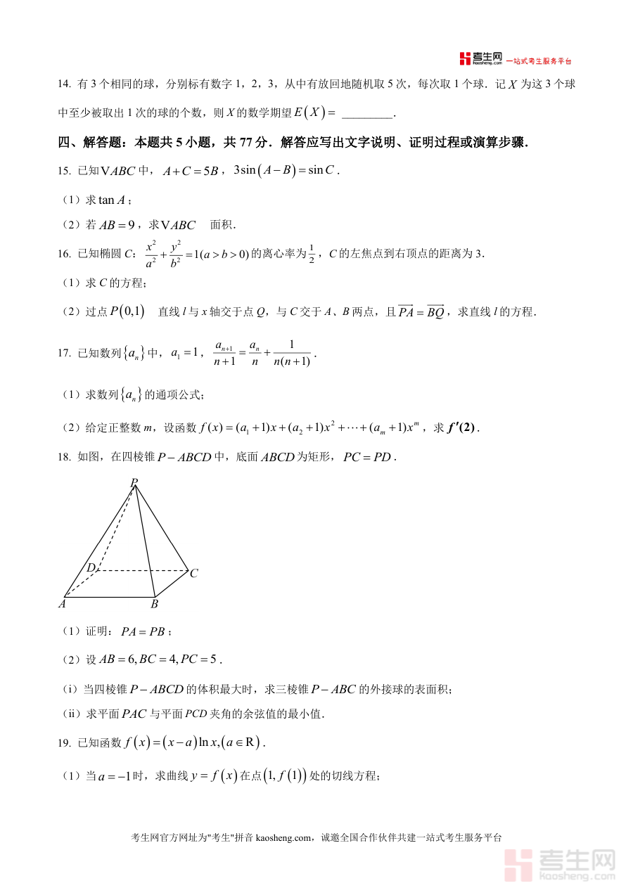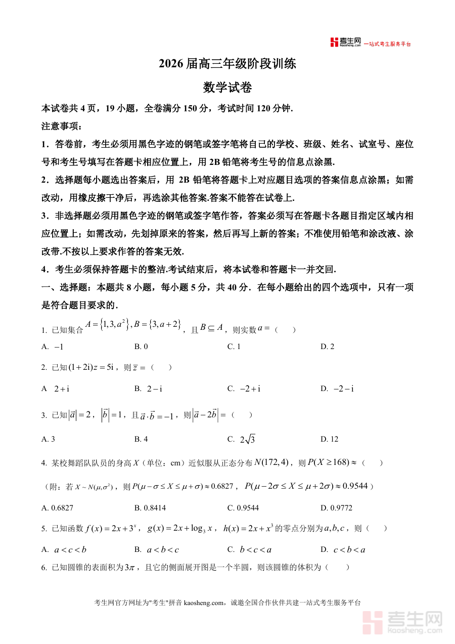《精品解析:广东省广州市越秀区2026届高三上学期10月阶段训练数学试题(原卷版).docx》是一份针对高三学生阶段性数学能力检测的权威备考资料。该资料严格遵循高考数学试卷结构规范,共4页包含19小题(选择题8道40分、多选题3道18分、填空题3道15分、解答题5道77分),满分150分且考试时长120分钟;内容覆盖集合运算、函数零点与单调性、圆锥体积计算、正态分布应用、椭圆方程求解、数列通项推导等高三上学期核心知识点。其特色在于以原卷版形式完整呈现考试流程与答题规范(如答题卡填写要求、作答格式说明),精准匹配广州越秀区本地教学进度与命题方向。
