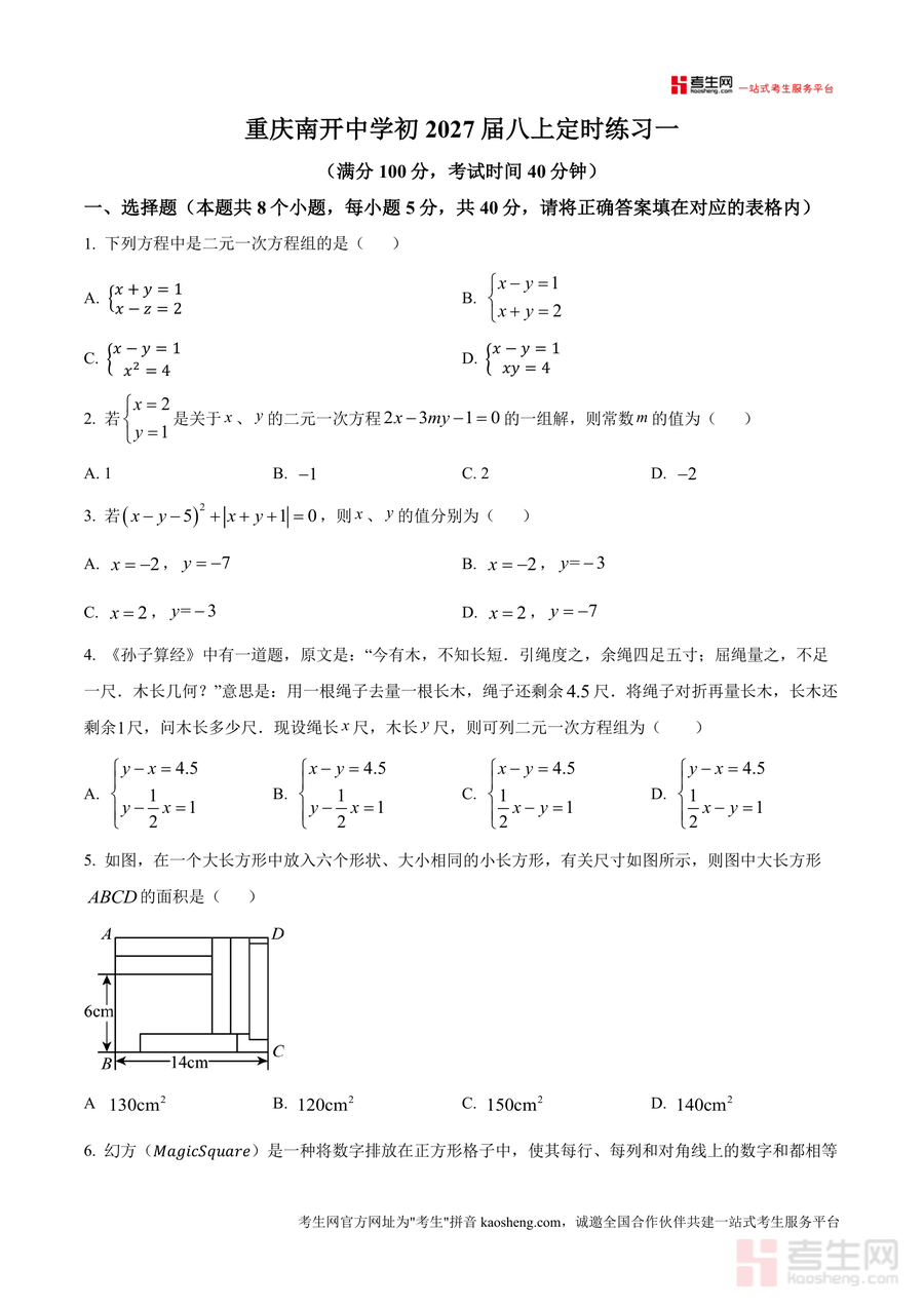 《精品解析:重庆市南开中学校2025-2026学年上学期八年级年级数学定时练习一(原卷版)》是一份针对八年级上学期数学核心知识点设计的同步训练资料。该资料以二元一次方程组为核心内容框架,包含选择题8道、填空题6道及解答题2道(含6个子题),题型覆盖概念辨析、解法应用、实际问题建模等多个维度,严格遵循重庆南开中学教学进度与命题风格。其特色在于题目设计兼顾基础巩固与能力拓展,融入《孙子算经》古题改编、幻方应用等情境化题型,既贴合教材知识点又体现数学学科素养培养要求。