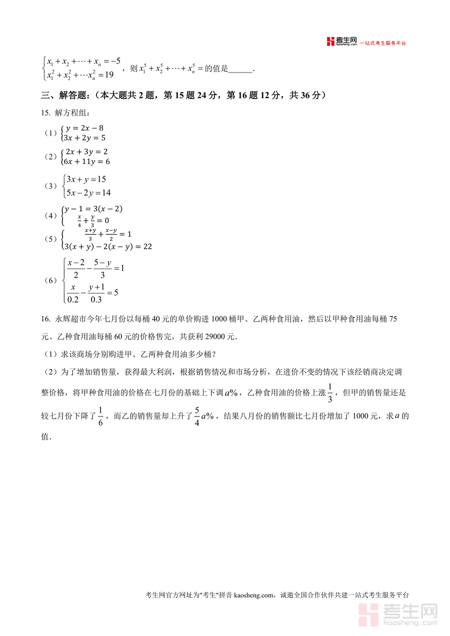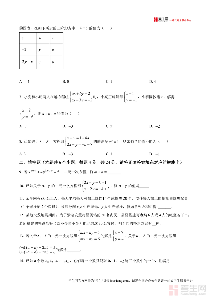 本资料适用于重庆南开中学初2027届八年级学生及使用人教版教材、需强化二元一次方程组模块学习的八年级学生。作为同步训练工具,它不仅是检验阶段性学习成果的重要载体,更是衔接课堂教学与中考备考的关键桥梁;其不可替代性体现在名校原创命题的权威性与针对性,长期价值则在于帮助学生构建扎实的代数思维框架,为后续函数、方程等进阶知识学习奠定基础。