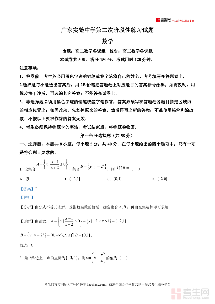 本资料适用于广州市越秀区及周边地区高三学生(尤其是目标冲刺优质高校 的考生)、高中数学教师及备考辅导机构教研人员。作为广东实验中学阶段性练习试题的解析版,它填补了本地名校最新月考真题解析资源稀缺性带来 的空白,其不可替代性体现在真题 的时效性与解析 的深度——不仅提供答案,更注重思维过程引导,帮助考生构建系统解题框架。长期来看,该资料可作为高三全年复习中的经典例题库,持续助力考生提升数学学科核心素养与应试能力。