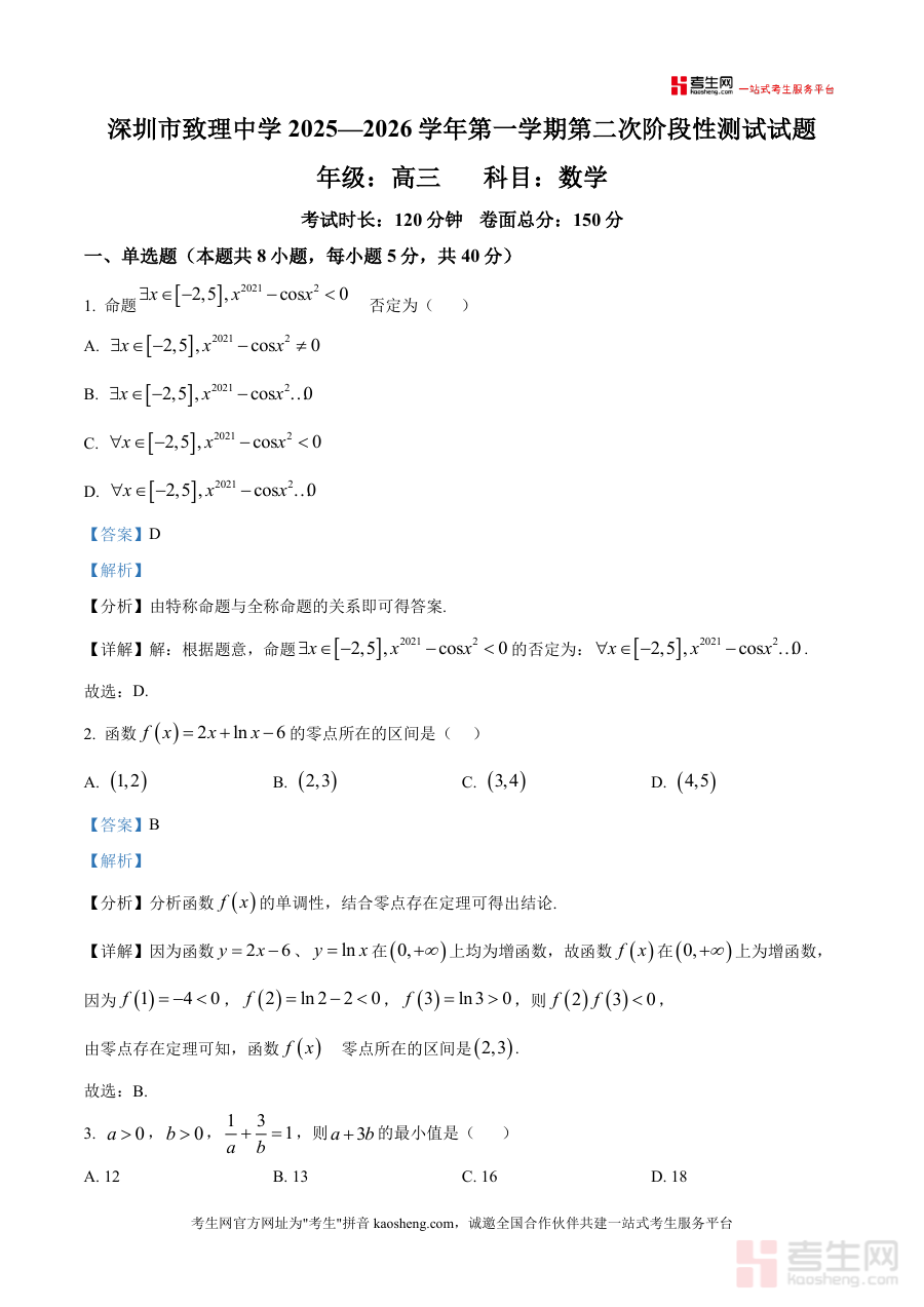 《精品解析:广东省深圳市致理中学2025-2026学年高三上学期10月月考数学试题(解析版).docx》是一份聚焦高三数学备考阶段的高质量真题解析资料,核心定位为深圳本地名校命题方向下的知识巩固与能力提升工具。资料涵盖单选(8题)、多选(3题)、填空(3题)、解答(5题)四大题型,覆盖函数单调性、导数应用、数列综合、立体几何、概率统计等高三核心考点;特色亮点在于每道题均配备详实解析,包含考点分析、分步解题过程、易错点提示及思维拓展,如函数零点问题结合零点存在定理与单调性分析,导数极值点问题转化为函数图像交点分析,帮助学生理解解题逻辑。