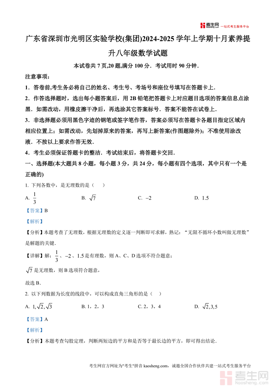 《精品解析:广东省深圳市光明区实验学校(集团)2024-2025学年上学期十月素养提升八年级数学试题(解析版)》是一份针对该校八年级学生上学期十月素养提升考试数学真题深度解析资料。该资料完整呈现试卷结构与内容:共7页20题满分100分用时90分钟,涵盖选择题8道(每题3分)、填空题5道(每题3分)及解答题7道(共61分);解析部分针对每道题配备考点分析(如无理数定义、勾股定理应用等核心知识点)、详细解答步骤及易错点点睛,清晰呈现解题逻辑与方法。
