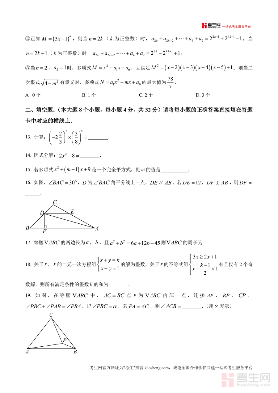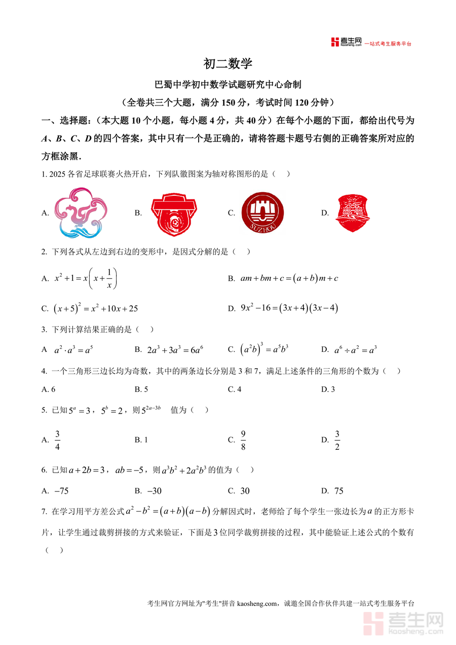 适用人群为重庆市及周边地区八年级数学学习者、初中数学教师及关注孩子数学成绩提升的家长;该文件具有显著必要性,因其是巴蜀中学官方校考真题,真实反映该校教学要求与测评标准;不可替代性体现在其命题权威性与本地化特色,长期价值在于帮助学生构建系统知识体系,强化核心考点掌握程度,为后续九年级数学学习及中考备考奠定坚实基础。