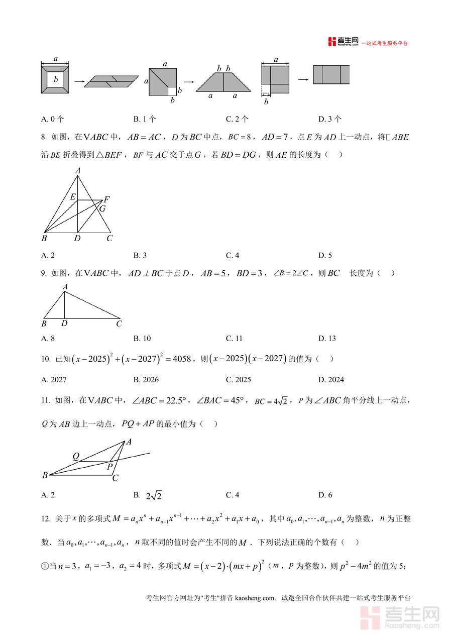 《精品解析:重庆市巴蜀中学校2025-2026学年八年级上学期10月月考数学试题(原卷版).docx》是一份由巴蜀中学初中数学试题研究中心权威命制的八年级上学期数学阶段性测评资料,主要包含12道选择题、8道填空题及6道解答题,覆盖轴对称图形判断、因式分解、三角形三边关系、整式运算、二元一次方程组等核心考点。其特色亮点在于命题严格遵循重庆本地教学大纲与校考导向,题型设置梯度分明,既注重基础概念的理解与应用,又融入综合思维能力的考查,能为学生提供贴近真实校考场景的测评体验。