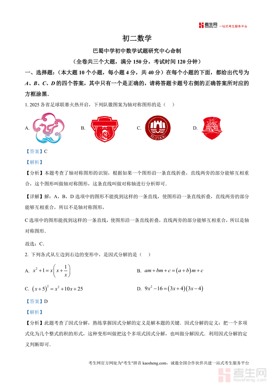 本资料适用于重庆市巴蜀中学八年级在读学生、初二数学教师及备考同类名校月考学生群体。作为贴合本地名校命题标准 的解析资料,其必要性在于填补了针对巴蜀中学月考专项解析资源空白,不可替代性体现在每道题均结合校考特色提供拓展思路,长期价值则在于帮助学生构建系统知识框架与高效解题思维,助力后续期中、期末及中考备考奠定基础。