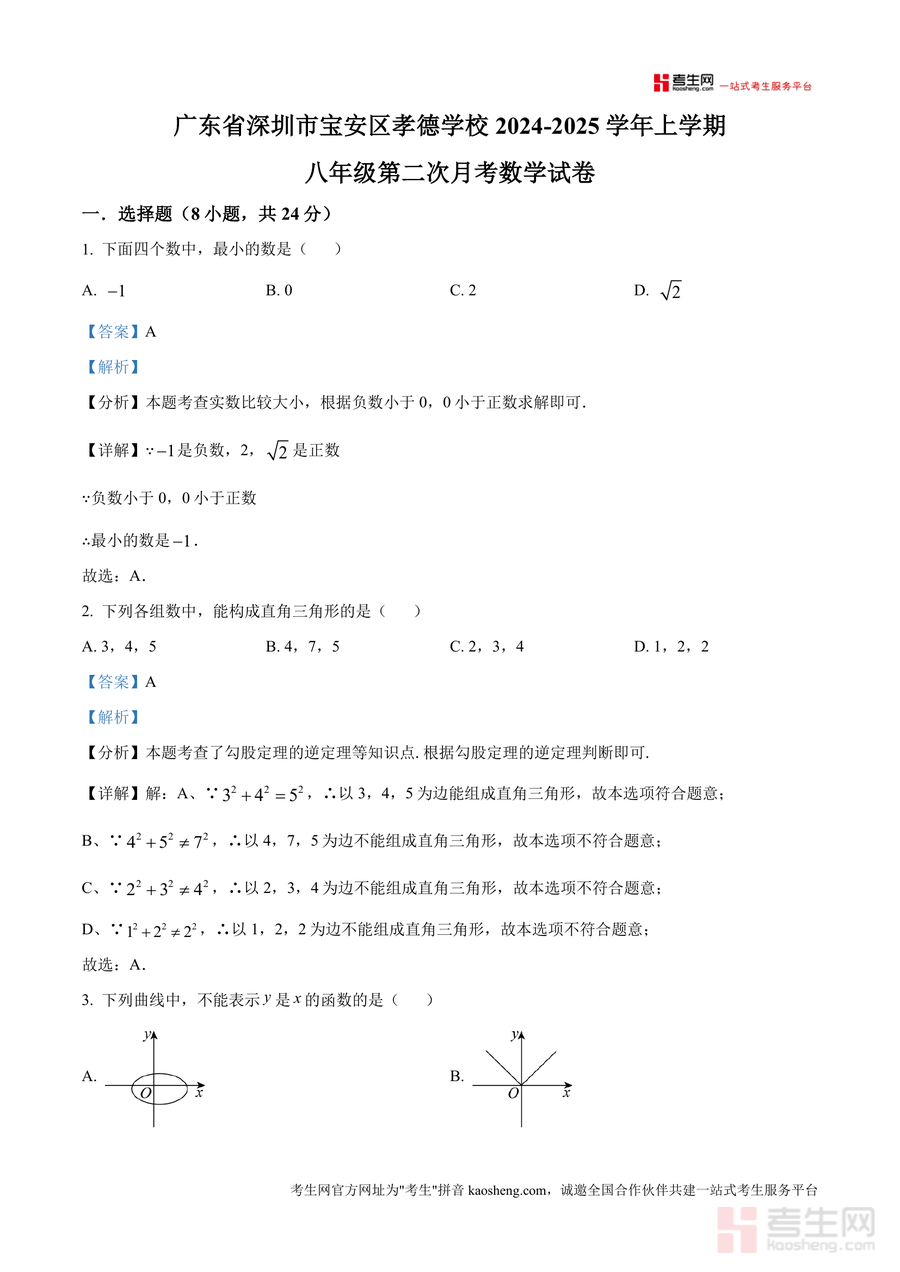 《精品解析:广东省深圳市宝安区孝德学校2024-2025学年上学期八年级第二次月考数学试卷(解析版).docx》是一份针对该校八年级上学期第二次月考数学真题编制的专业备考资料,涵盖选择题、填空题、解答题三大题型共20道题目。每份题目均配备详实解析,包括考点精准定位(如勾股定理逆定理应用、函数概念辨析等核心知识点)、解题步骤分层拆解及易错点警示,特色在于结合宝安区本地教学进度与学情,将真题训练与方法迁移深度融合,助力学生理解考点本质而非机械刷题。
