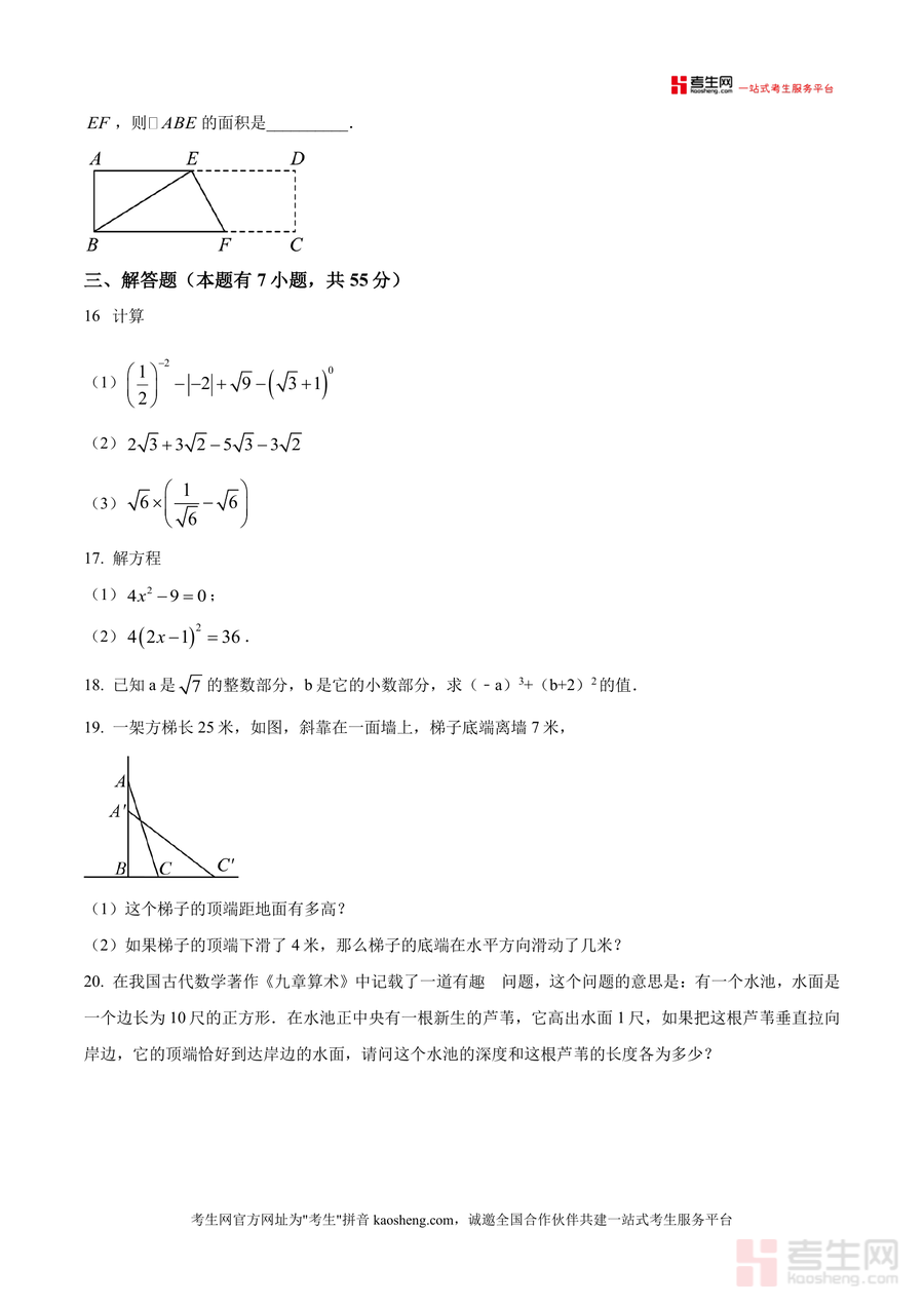 该资料适用于深圳市耀华实验学校八年级学生、初中数学教师及学生家长。作为该校开学后首次月考的真题原卷,它是学生备考月考不可替代的核心资源,能真实反映该校教学要求与学生学习现状;其长期价值在于帮助学生夯实数学基础,为后续学习勾股定理综合应用、二次根式运算等进阶内容奠定扎实根基,助力学生数学能力持续提升。