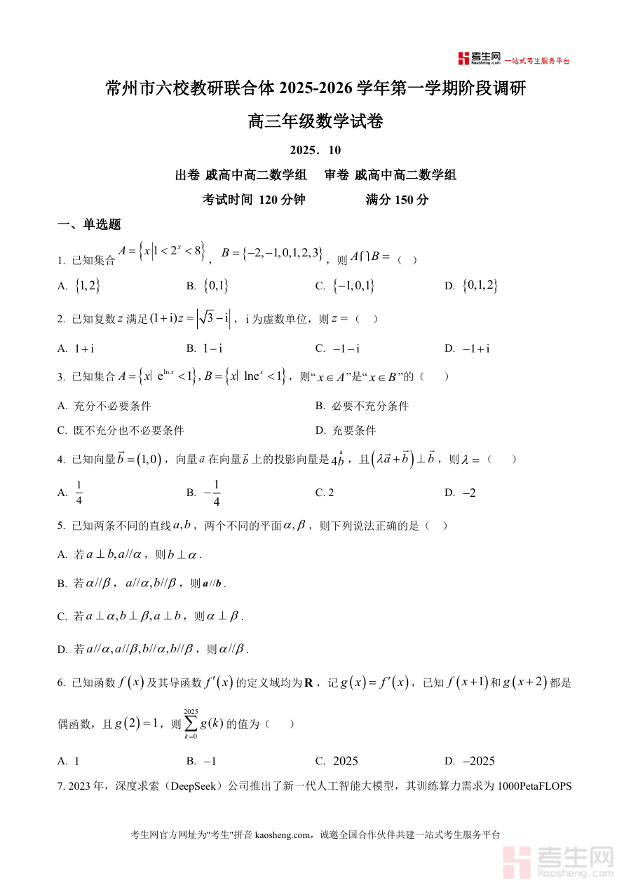 《精品解析:江苏省常州市六校教研联合体2025-2026学年高三上学期第一阶段调研数学试卷(原卷版)》是一份聚焦高三数学阶段性能力评估的权威原卷资料。该试卷由戚高中高二数学组完成出卷与审卷工作,考试时长120分钟、满分150分,题型覆盖单选题(8道)、多选题(3道)、填空题(3道)及解答题(5道)等完整结构。其核心特色在于依托六校教研联合体协同优势,命题紧密贴合江苏高考数学考点与常州地区教学进度——基础模块包含集合运算、复数性质等知识点,综合模块涉及函数导数应用、立体几何证明计算、三角函数综合等内容,能全面检测学生第一阶段知识掌握程度与解题能力。