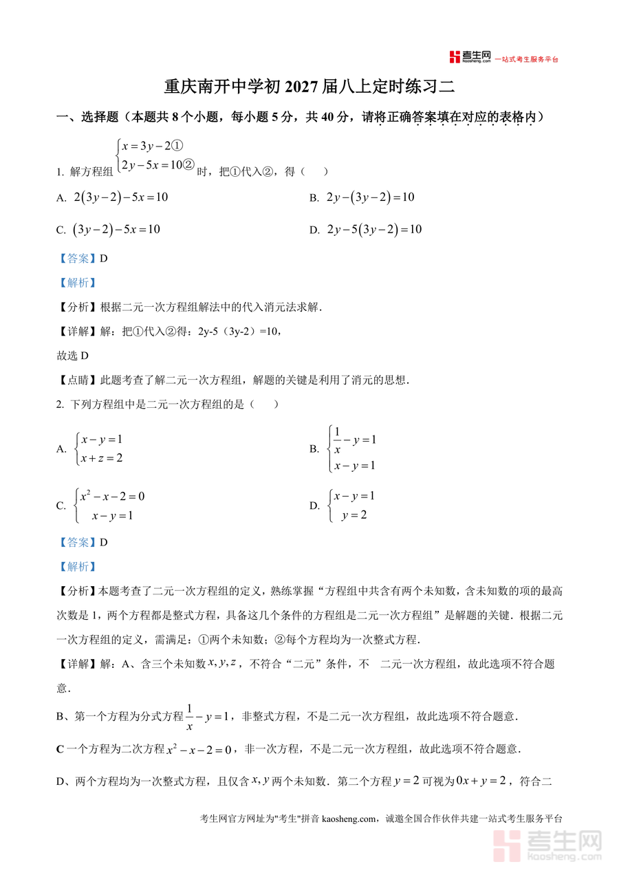 《精品解析:重庆市沙坪坝区南开中学2025-2026学年八年级数学上册定时练习二(解析版).docx》是一份针对初中八年级上册数学核心知识点设计的高质量真题解析资料,聚焦二元一次方程组解法、勾股定理应用等重点考点,覆盖选择题(8道)、填空题(6道)、解答题(2道)三大题型共16道典型题目。资料特色在于每道题均配备详尽考点分析、规范解题步骤及精准思路点睛,例如对代入消元法、加减消元法等核心解题方法深度拆解,对勾股定理在几何图形阴影面积计算中的实际应用场景梳理,帮助学生理解题目背后知识逻辑与解题技巧。