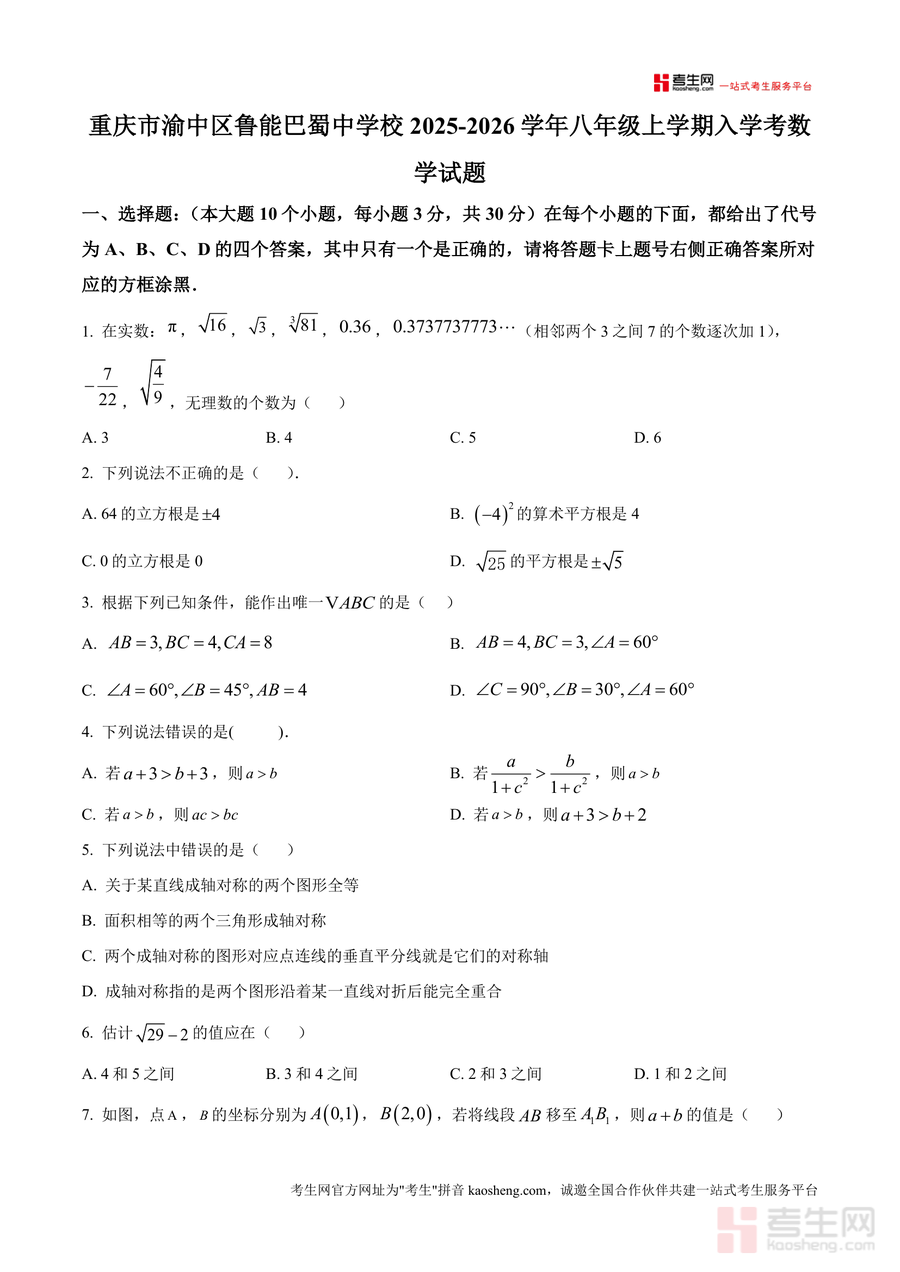 《精品解析:重庆市渝中区鲁能巴蜀中学校2025-2026学年八年级上学期入学考数学试题(原卷版).docx》是一份聚焦八年级新生入学适应性评估需求的权威备考资料,精准呈现该校数学入学考试命题框架与考查重点。文件包含完整原卷内容:10道选择题(覆盖无理数判断、三角形全等判定、轴对称性质等基础考点)、6道填空题(涉及坐标运算、极差数定义应用等)及5道解答题(含实数计算、统计分析、二元一次方程组应用、几何证明等综合题型);其特色亮点在于贴合鲁能巴蜀中学命题风格——既注重基础概念夯实,又融入创新性题型设计(如组合数对分析、整数点坐标规律探究),全面考查学生数学核心素养。