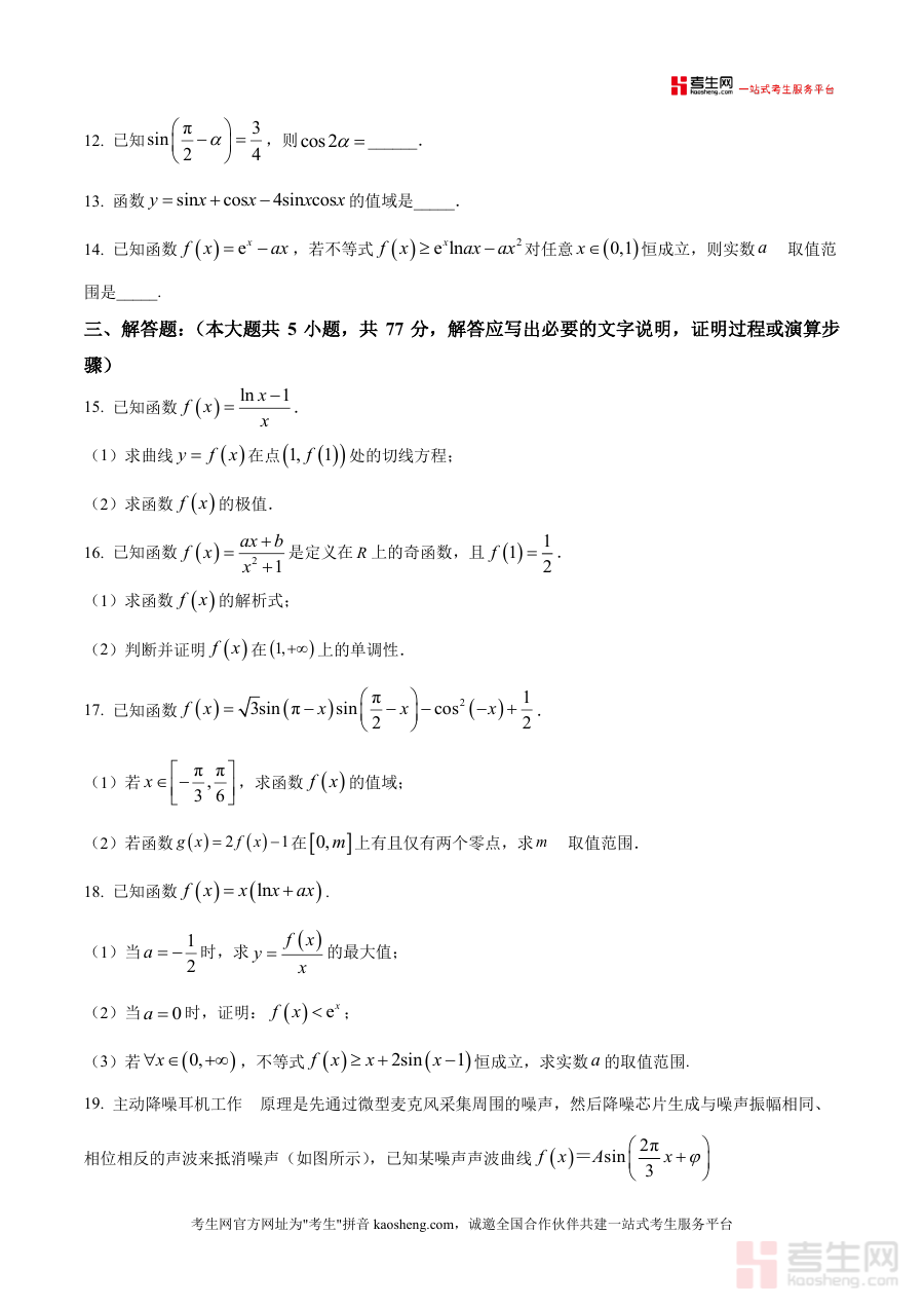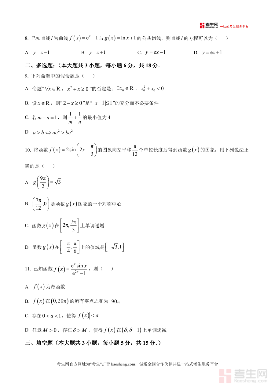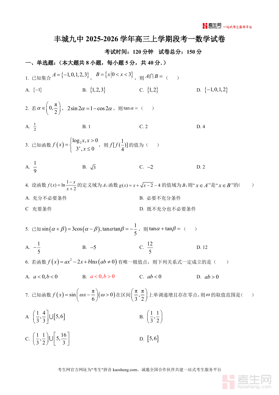 《精品解析:江西省宜春市丰城市第九中学2025-2026学年高三上学期第一次段考数学试题(原卷版).docx》是一份面向高三学生的数学阶段性考试真题资料。该资料包含单选题8道、多选题3道、填空题3道、解答题5道四大题型,覆盖集合运算、函数定义域与值域、三角函数图像变换、导数极值与切线方程等核心考点,严格遵循高考120分钟考试时长与150分总分值设置。其特色亮点在于完整保留原卷排版与题型分布,还原真实考试场景细节,助力学生提前适应高三段考的节奏与难度。