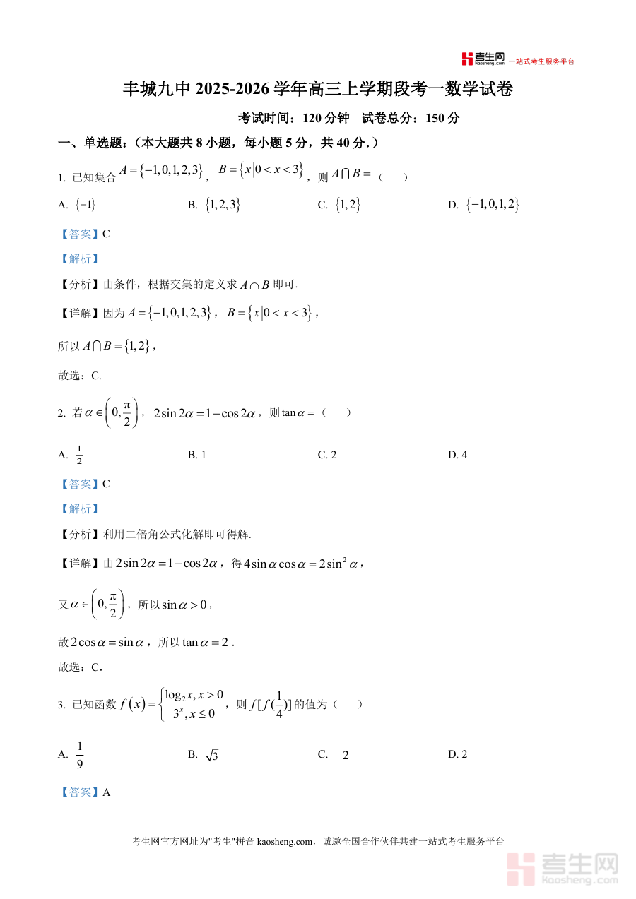 《精品解析:江西省宜春市丰城市第九中学2025-2026学年高三上学期第一次段考数学试题(解析版)》是一份聚焦高三数学阶段性复习的优质备考资料。该资料涵盖单选题、多选题、填空题及解答题四大题型,全面覆盖集合运算、三角函数化简、导数应用、函数单调性与极值等核心考点;每个题目均配备详细解析,包含考点定位、解题思路推导及方法技巧总结,特色在于将抽象知识点与具体题目深度结合,帮助学生构建系统知识体系并强化解题逻辑。