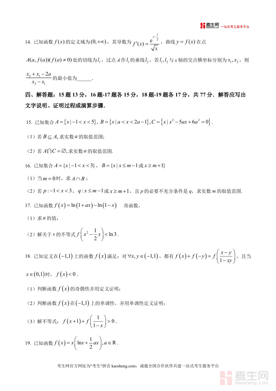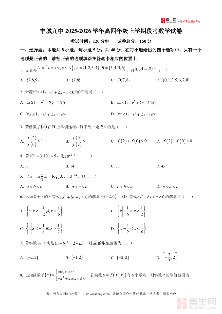 《精品解析:江西省宜春市丰城市第九中学2025-2026学年高三(复读班)上学期第一次段考数学试题(原卷版).docx》是一份聚焦高三复读生数学学科阶段性巩固与能力提升的专业备考资料。文件严格遵循高考命题规范与丰城九中复读班教学进度设计,包含完整试卷结构:8道单项选择题(共40分)、3道多项选择题(共18分)、3道填空题(共15分)及5道解答题(共77分),覆盖集合运算、命题逻辑、函数单调性与奇偶性、不等式解法、导数应用等高考核心考点;其特色在于结合江西本地教学大纲与复读生知识断层修复需求,试题梯度合理,既注重基础概念的回归巩固,又强化综合解题能力训练。
