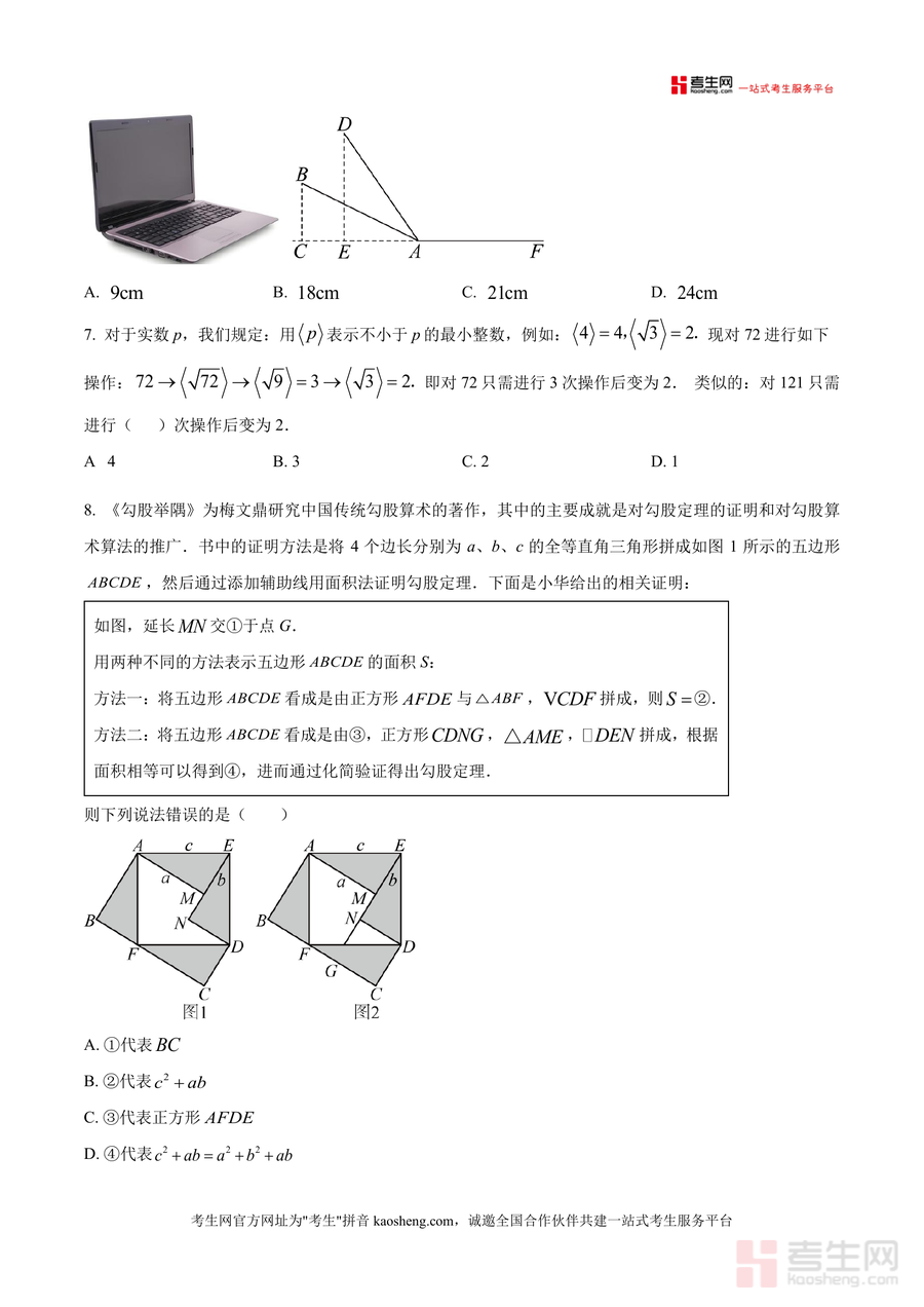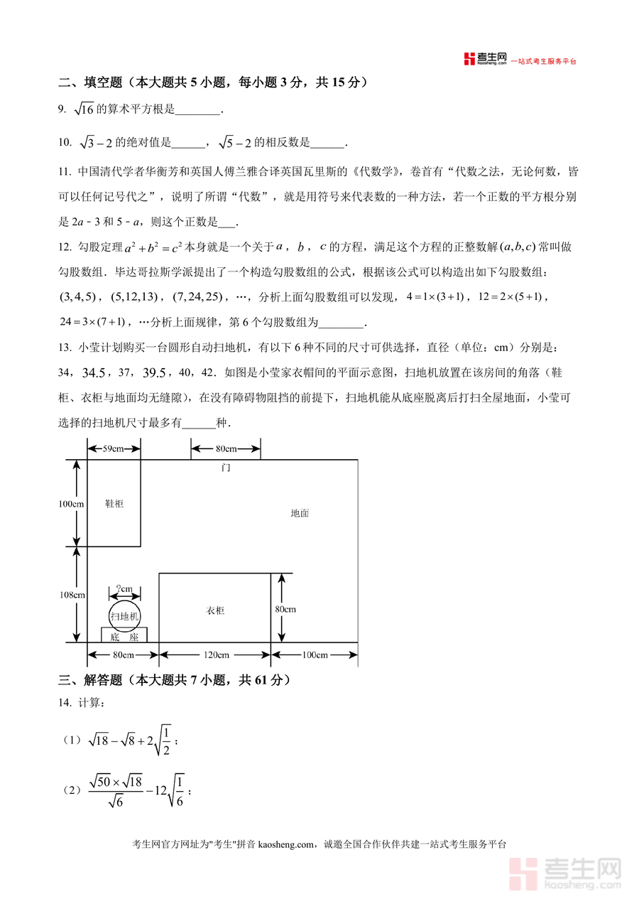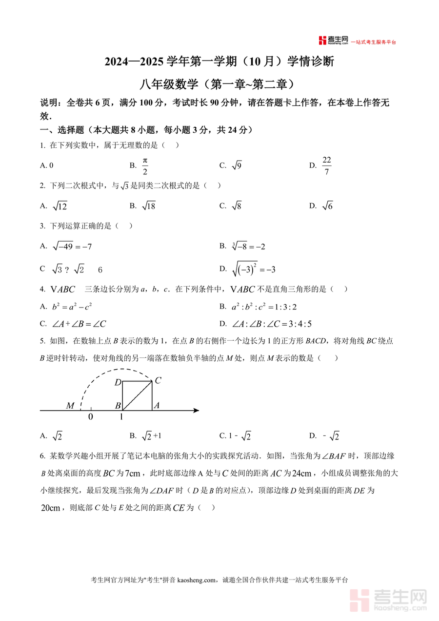 《精品解析:广东省深圳市龙岗区2024-2025学年上学期八年级10月月考数学试卷(原卷版).docx》是一份针对龙岗区八年级学生的高质量备考资料,聚焦2024-2025学年上学期第一章至第二章核心知识点,包含无理数识别、二次根式运算、勾股定理应用等关键内容。该试卷严格遵循本地学情诊断要求,题型结构完整(8道选择、5道填空、7道解答),题目设计兼顾基础巩固与能力拓展:基础题覆盖概念辨析(如无理数判断)与基本运算(如二次根式化简),能力题融入实际应用(如圆柱侧面最短路径)、新定义探究(如黑神话悟空三角形)及数学文化元素(如梅文鼎勾股定理证明),全面贴合本地教学与命题趋势。