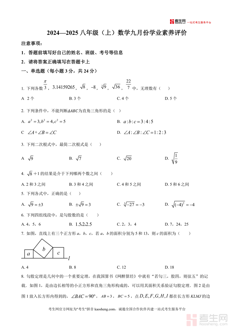 《精品解析:广东省深圳市龙岗区同心实验学校2024—2025学年上学期八年级10月月考数学试卷(原卷版).docx》是一份聚焦深圳龙岗区初中数学学情、贴合同心实验学校教学进度的优质备考资料。文件完整呈现该校八年级上学期第一次月考数学真题原貌,涵盖无理数识别、勾股定理应用、二次根式化简等核心知识点,题型包括单选题(8道)、填空题(5道)及解答题(6道),全面覆盖基础巩固与能力提升层面,能精准反映该校阶段性教学重点与命题方向。