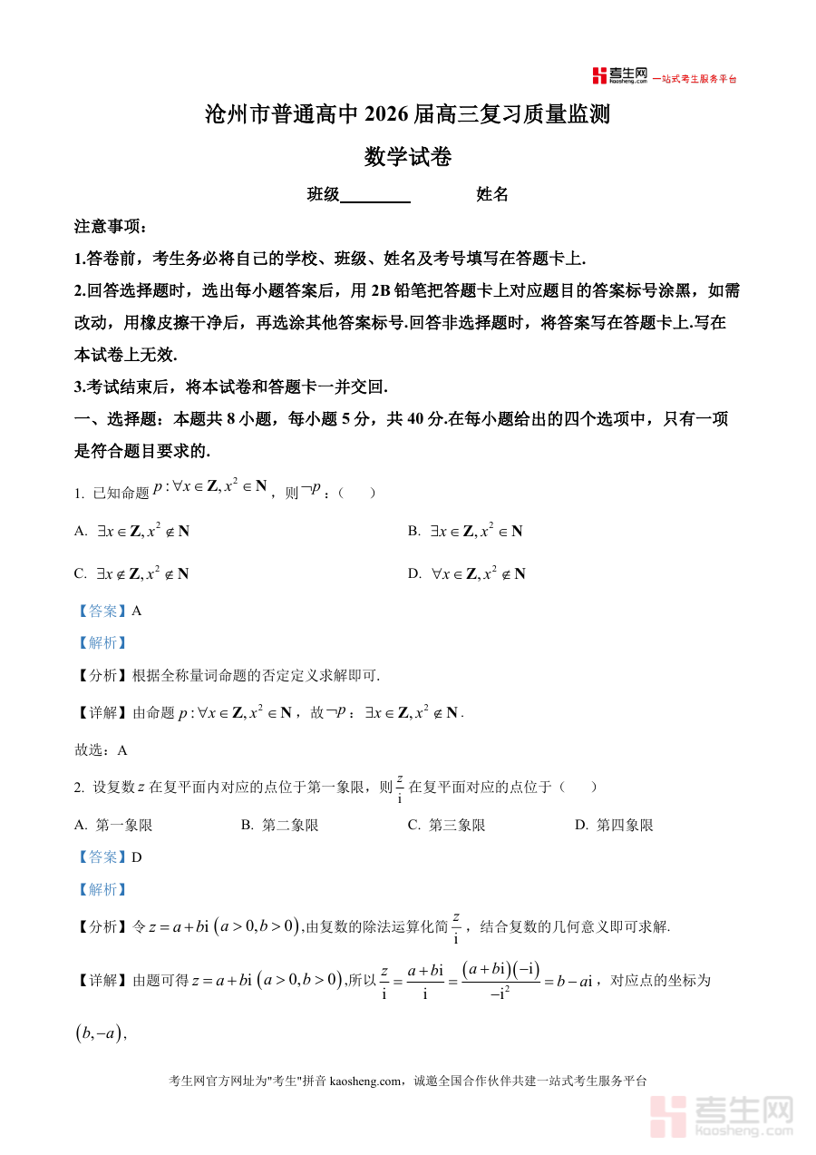 《精品解析:河北省沧州市2025-2026学年高三上学期10月复习质量监测数学试卷(解析版)》是一份面向高三学生数学一轮复习阶段设计的高质量备考资料,涵盖选择题、填空题、解答题等完整题型结构,并配套逐题详细解析。该资料以沧州市本地学情为基础编制,每道题目均包含考点分析、步骤详解及思路拓展——如选择题中的全称量词命题否定、复数几何意义等考点剖析精准,解答题中的空间几何证明、数列求和等步骤逻辑清晰——既还原了考试原题情境,又通过解析环节强化对核心知识点理解与应用,是兼具真题训练与知识巩固功能综合性学习资源。