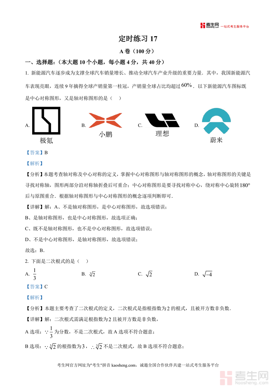 《精品解析:重庆市第八中学校2025-2026学年上学期八年级数学周测试卷(定时练习17)(解析版)》是一份针对重庆八中八年级上学期数学周测设计的专业备考资料,包含定时练习17全卷内容及逐题详细解析。该资料覆盖轴对称图形判定、二次根式定义、因式分解方法、一次函数图像性质等核心知识点,每个题目均配有清晰分析步骤与解题思路——如选择题中对中心对称与轴对称图形概念对比讲解,填空题里因式分解的技巧点拨,解答题中的逻辑推导过程等,能帮助学生快速理解考点本质。