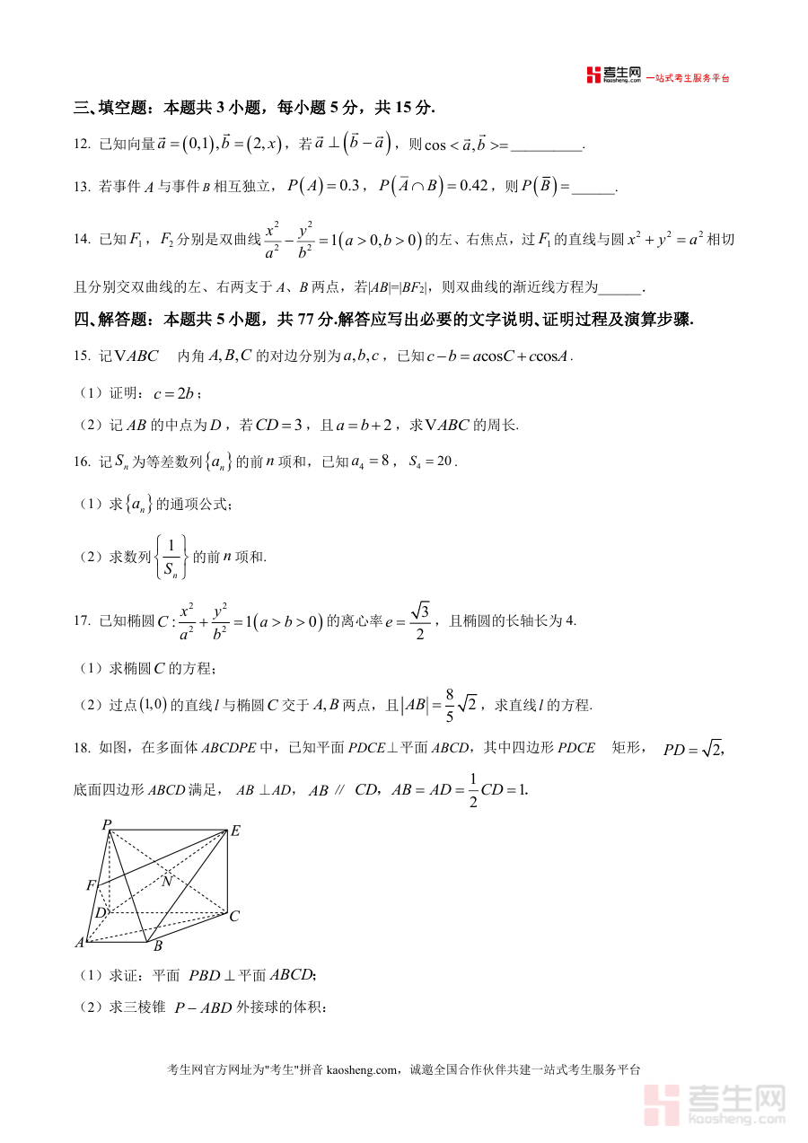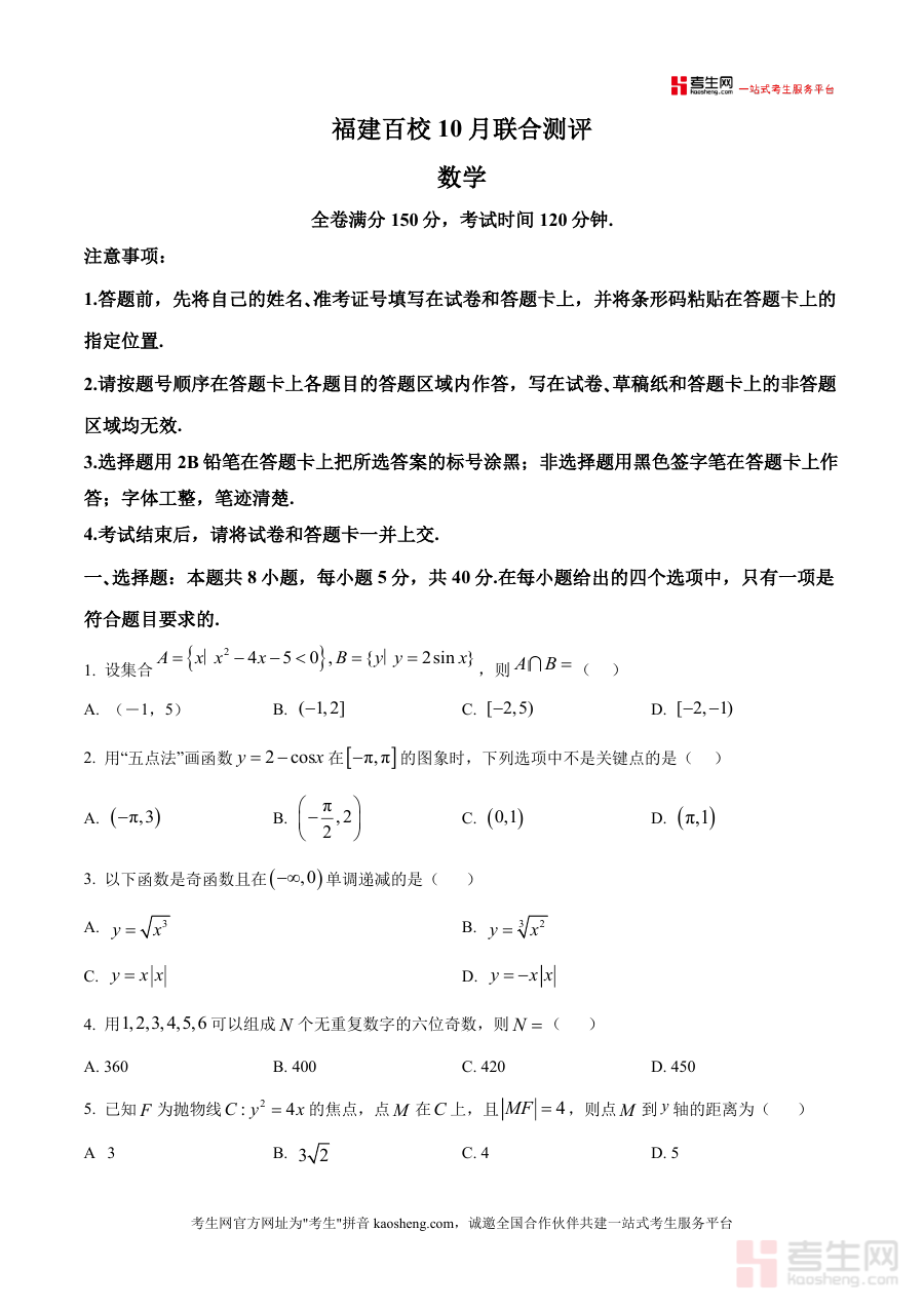 《精品解析:福建省百校2026届高三上学期10月联合测评数学试题(原卷版)》是一份服务于福建省高三学生阶段性备考需求的权威资料。该资料整合原卷试题与精品解析两部分内容:原卷严格遵循高考数学考试标准设置全卷150分、120分钟时长;题型涵盖8道单选题(40分)、3道多选题(18分)、3道填空题(15分)及5道解答题(77分);解析部分针对每道题目提供考点溯源、详细解题步骤及易错点提示。其核心亮点在于依托福建省百校联合测评的命题资源,题型覆盖函数性质、圆锥曲线、立体几何等高中数学核心模块,并贴合本省高考命题趋势,为学生提供具有区域代表性的实战训练素材。