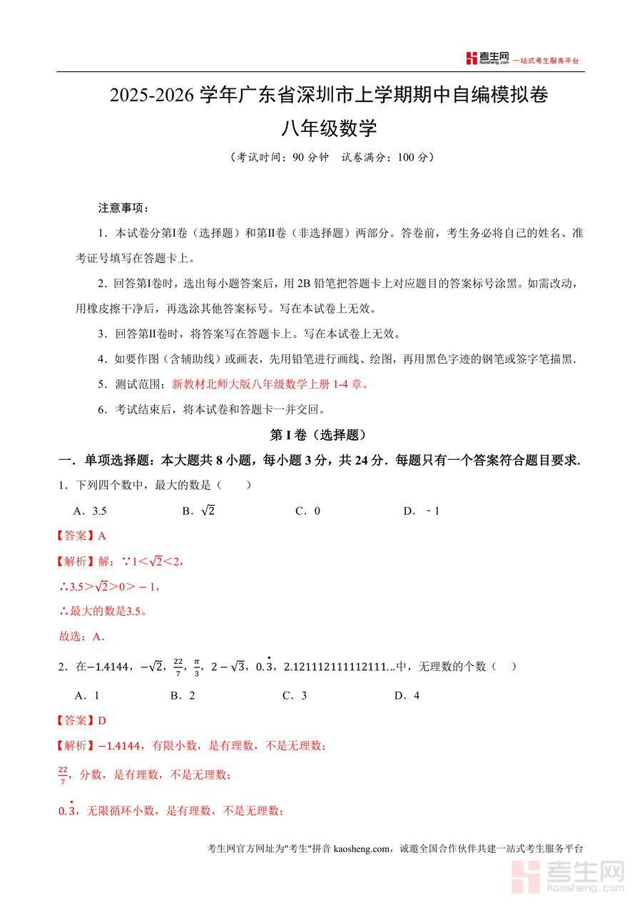 适用人群明确为深圳市使用北师大版新教材的八年级学生、一线数学教师及关注孩子学业提升的家长。该资料必要性在于精准覆盖期中考点,填补本地考情自编模拟资源空白;不可替代性体现在结合详细解析与本地命题特色,高效助力解题能力提升;长期价值则在于通过系统练习培养数学思维与解题逻辑,为后续学习奠定坚实基础。