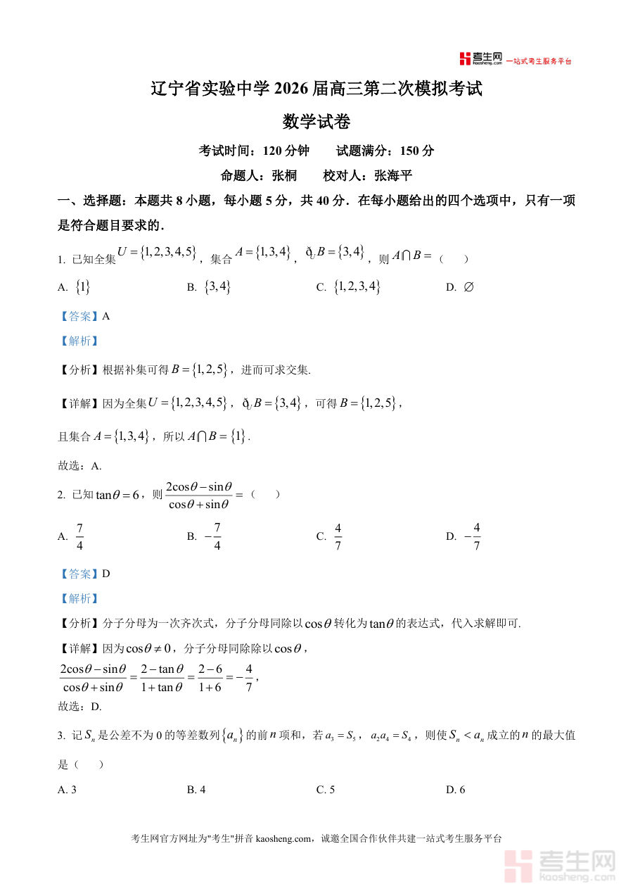 本资料适用于辽宁省实验中学2026届高三学生、省内其他高三备考考生及高中数学教师。其必要性在于作为高三关键阶段模拟考解析资料,结合本地命题特色与高考趋势设计内容;不可替代性体现在每道题均由专业命题团队(命题人张桐、校对人张海平)把关质量;长期价值则在于帮助学生构建系统解题框架形成高效应试策略,并为后续高考冲刺积累实战经验。