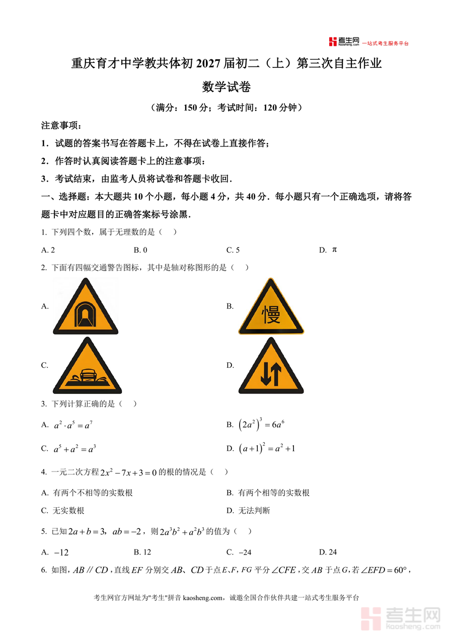 《精品解析:重庆市育才中学校2025-2026学年八年级上学期第三次自主作业数学试卷(原卷版).docx》是一份针对重庆育才中学教共体初2027届八年级学生设计的数学阶段性检测原卷资料。该试卷严格遵循该校教学进度与难度要求,满分150分、考试时长120分钟,包含选择题(10小题共40分)、填空题(6小题共24分)、解答题(9大题共86分)三大题型;内容覆盖无理数识别、轴对称图形判断、代数运算、一元二次方程根判别、几何证明与计算、实际应用问题等核心知识点。其特色在于题型设计紧密结合重庆本地中考命题趋势,并融入规律探究、函数应用、几何综合等能力型题目。