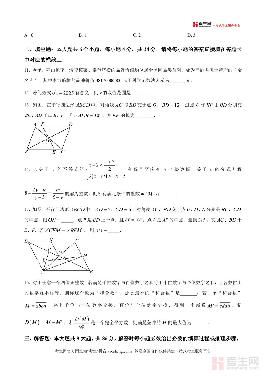该试卷核心用途为帮助学生完成阶段性知识巩固与自我检测。使用场景包括课堂自主作业训练、课后复习效果验证及家庭作业补充练习;用户价值体现在让学生熟悉本校命题风格与难度梯度,并精准定位知识漏洞;备考优势在于通过针对性训练提升应试能力——如解答题中的分式方程求解、不等式组整数解分析、几何证明题等,均为重庆中考高频考点,能有效强化学生解题技巧。
