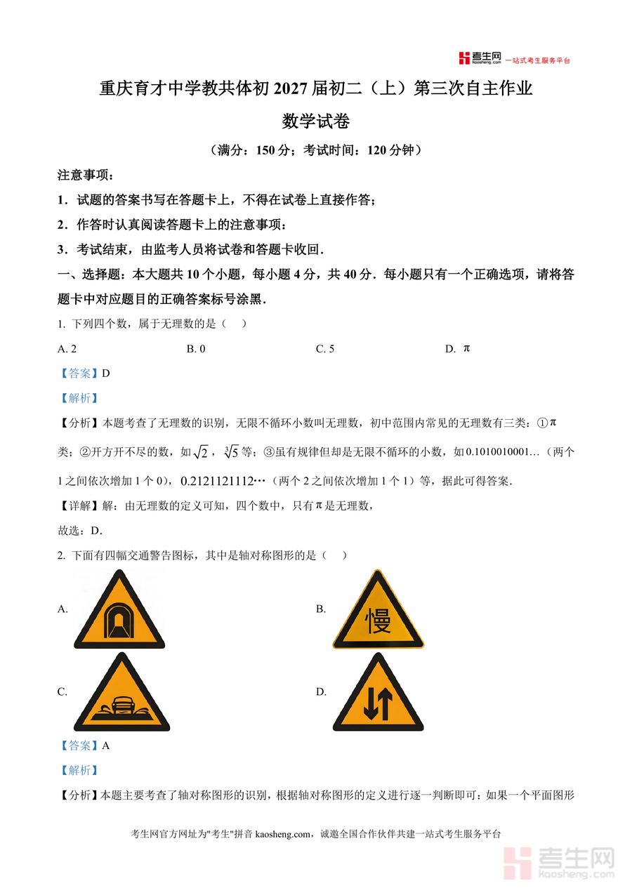 《精品解析:重庆市育才中学校2025-2026学年八年级上学期第三次自主作业数学试卷(解析版)docx》是一份针对重庆育才中学教共体初2027届初二上学期数学阶段性检测的优质真题解析资料。该资料完整呈现试卷原题,覆盖选择、填空、解答三大题型共9大题,每道题目均配有详尽解析,包括考点分析、解题步骤拆解及易错点提示。其特色亮点在于结合教材核心知识点,注重方法归纳与思维引导:如无理数识别题强调概念本质,轴对称图形判断题明确定义应用,代数运算题突出公式逆用与规范步骤,几何题则融入辅助线技巧与定理推导逻辑,为学生提供全面的解题指导。