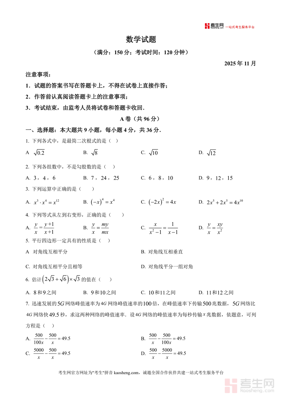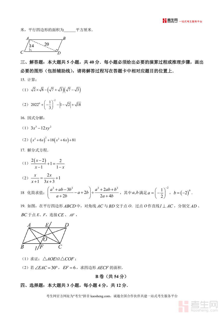 《精品解析:重庆市西南大学附属中学校2025-2026学年八年级上学期定时训练数学周测(2025.11.16)(原卷版).docx》是一份针对西南大学附中八年级学生数学阶段性学习设计的定时训练原卷资料。该资料严格遵循该校教学进度与重庆中考命题导向,包含满分150分、时长120分钟的完整试题结构,分为A卷(96分)与B卷(54分),覆盖二次根式化简、勾股数判断、平行四边形性质、分式方程求解等核心知识点,题型涵盖选择题、填空题、解答题等多种形式。其特色亮点在于试题梯度合理,既注重基础概念考查又强化综合应用能力训练,能精准反映学生阶段性学习成效,助力知识体系构建。