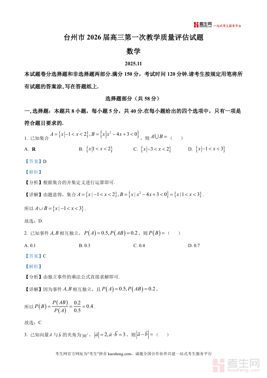 本资料适用于椒江区等五地高三学生、数学教师及备考辅导者。作为高考前关键模拟参考,其必要性在于一模试题能反映学生当前知识掌握程度,解析版可高效转化错题价值;不可替代性体现在贴合本地学情针对性指导,填补通用资料与区域命题差异空白;长期价值则是助力学生构建完整知识体系,为二轮专题复习及高考冲刺奠定坚实基础,是高三数学备考阶段不可或缺的数据支撑资料。