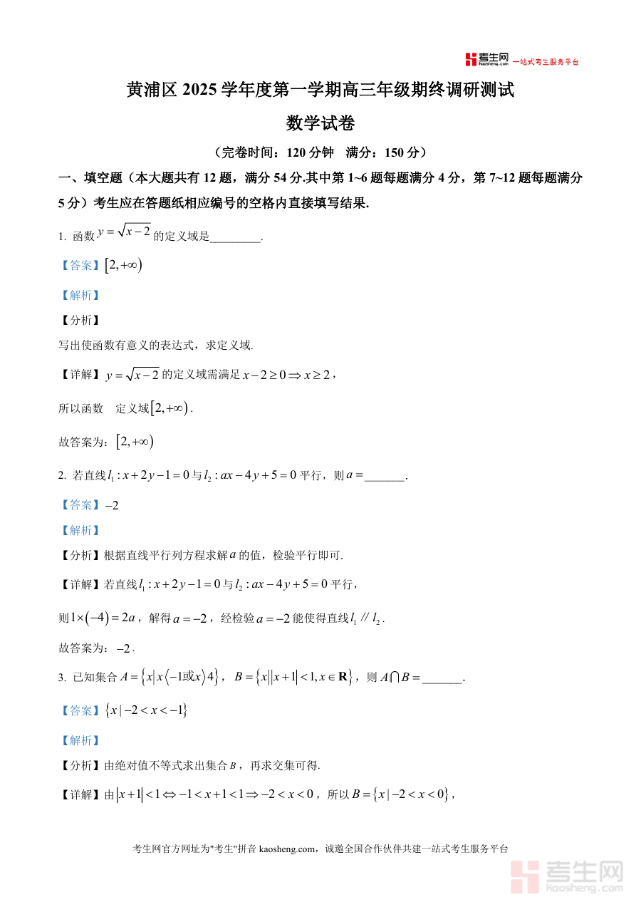 《精品解析:上海市黄浦区2025-2026学年高三上学期期终调研测试(一模)数学试题(解析版).docx》是一份聚焦黄浦区高三数学一模考试需求打造的专业真题解析资料。该资料完整覆盖试卷全部题型,包括12道填空题、4道选择题及5道解答题,每题均配备详尽解析内容——不仅呈现标准答案推导过程,还融入考点定位、解题思路拆解及易错点警示,如函数定义域问题条件转化技巧、立体几何二面角计算中的空间坐标系构建方法等,凸显了真题解析资料对考点深度挖掘与解题方法提炼特色。