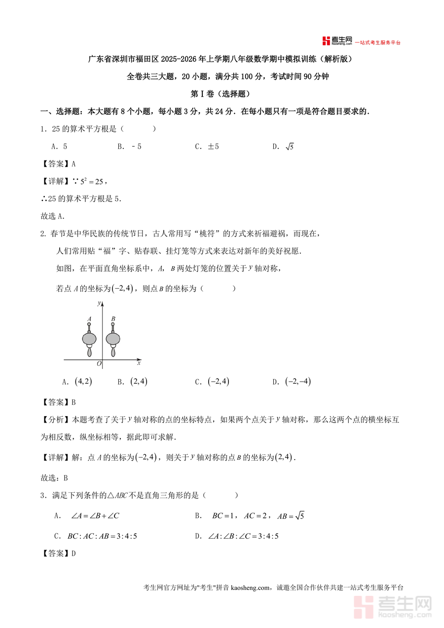 《广东省深圳市福田区2025-2026年上学期八年级数学期中模拟训练(解析版).docx》是一份针对福田区八年级学生期中备考设计的精准模拟训练资料,核心定位为贴合本地考情的实战型备考资料。资料包含三大题20小题共100分,考试时长90分钟,题型覆盖选择、填空及解答三类,考点涵盖算术平方根计算、轴对称坐标变换、直角三角形判定、勾股定理实际应用等八年级上册核心知识。特色亮点在于解析的深度与专业性:每个题目均配备标准答案及详细解析,包括考点分析(如选择第3题涉及三角形内角和与勾股逆定理)、解题思路拆解(如填空第10题芦苇问题通过勾股定理建立方程)、步骤细化演示(如解答题二次根式混合运算分步推导),帮助学生理解知识本质而非机械记忆。